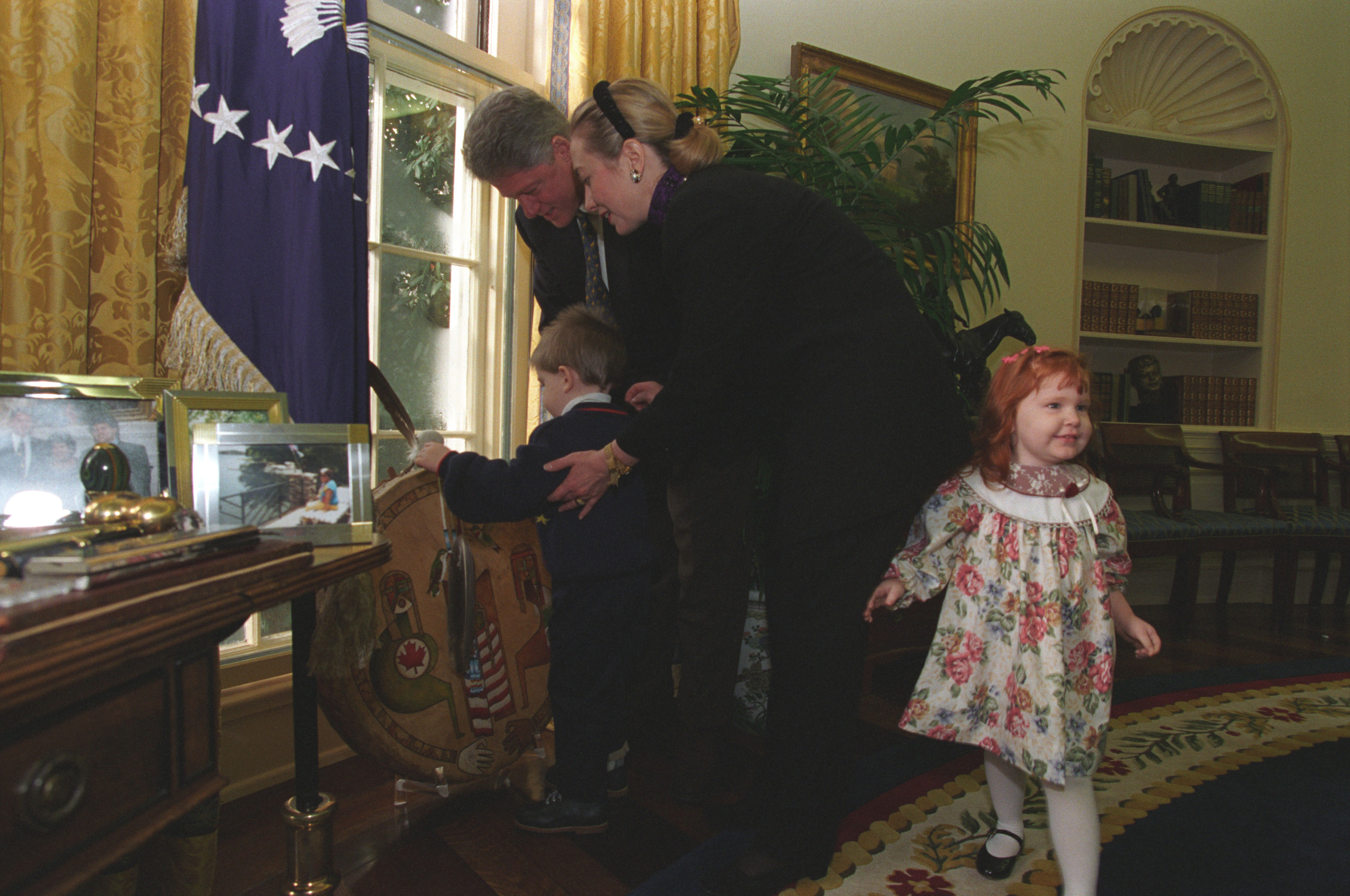 President Clinton and First Lady Hillary Rodham Clinton show photos and other items in the Oval Office to Brendon Denny and Rebecca Denny, children wh...Read morePresident Clinton and First Lady Hillary Rodham Clinton show photos and other items in the Oval Office to Brendon Denny and Rebecca Denny, children who were injured in the Oklahoma City bombing. They Denny family were guests at the President's Radio Address, January 6, 1996, Photographer: Barbara Kinney. Read lessP35645-04a