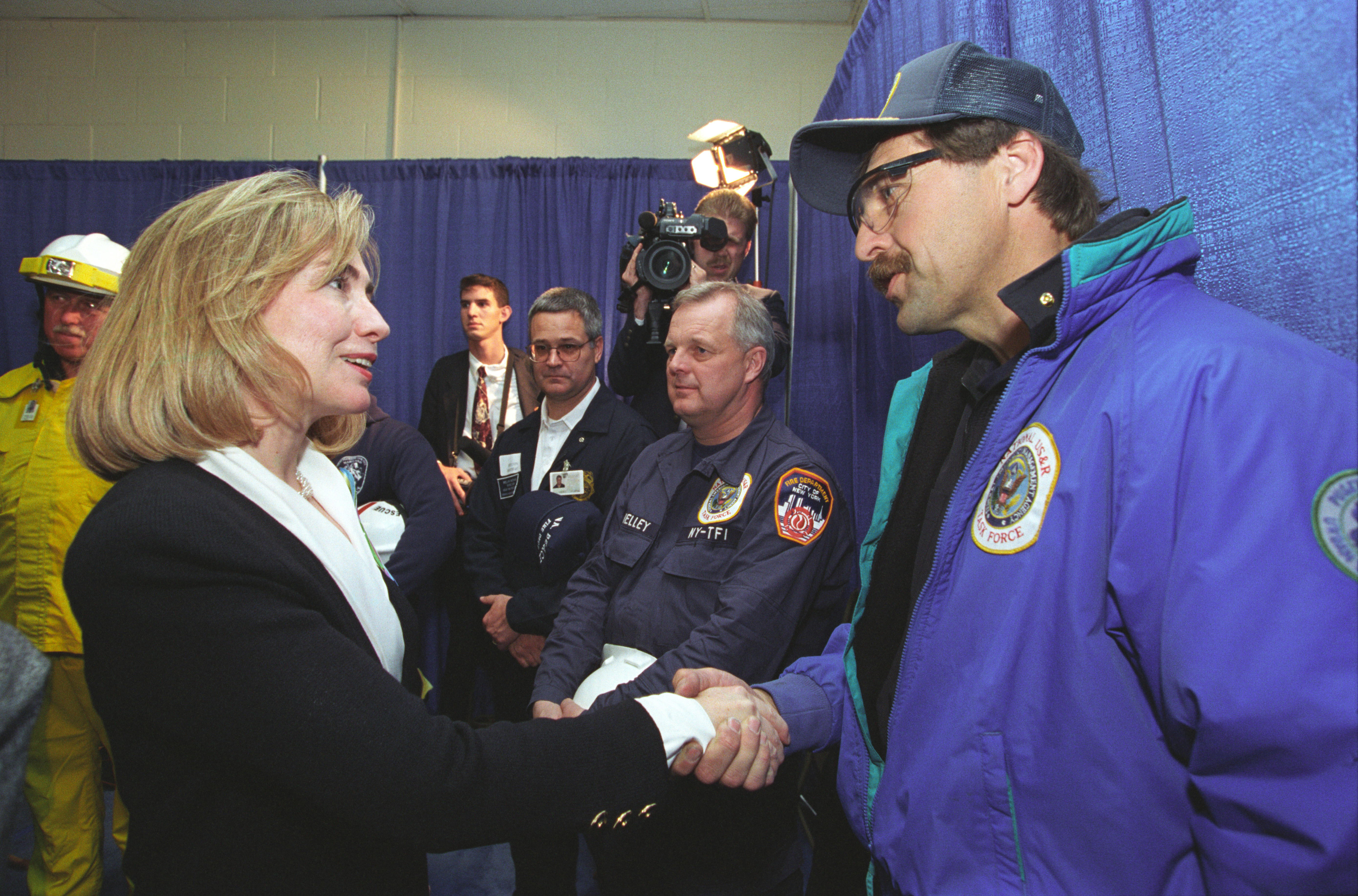 First Lady Hillary Rodham Clinton greets local first responders at the Memorial Service for the Oklahoma City Murrah Federal Building bombing, April 2...Read moreFirst Lady Hillary Rodham Clinton greets local first responders at the Memorial Service for the Oklahoma City Murrah Federal Building bombing, April 23, 1995, Photographer: Ralph Alswang. Read lessP27068-04a