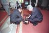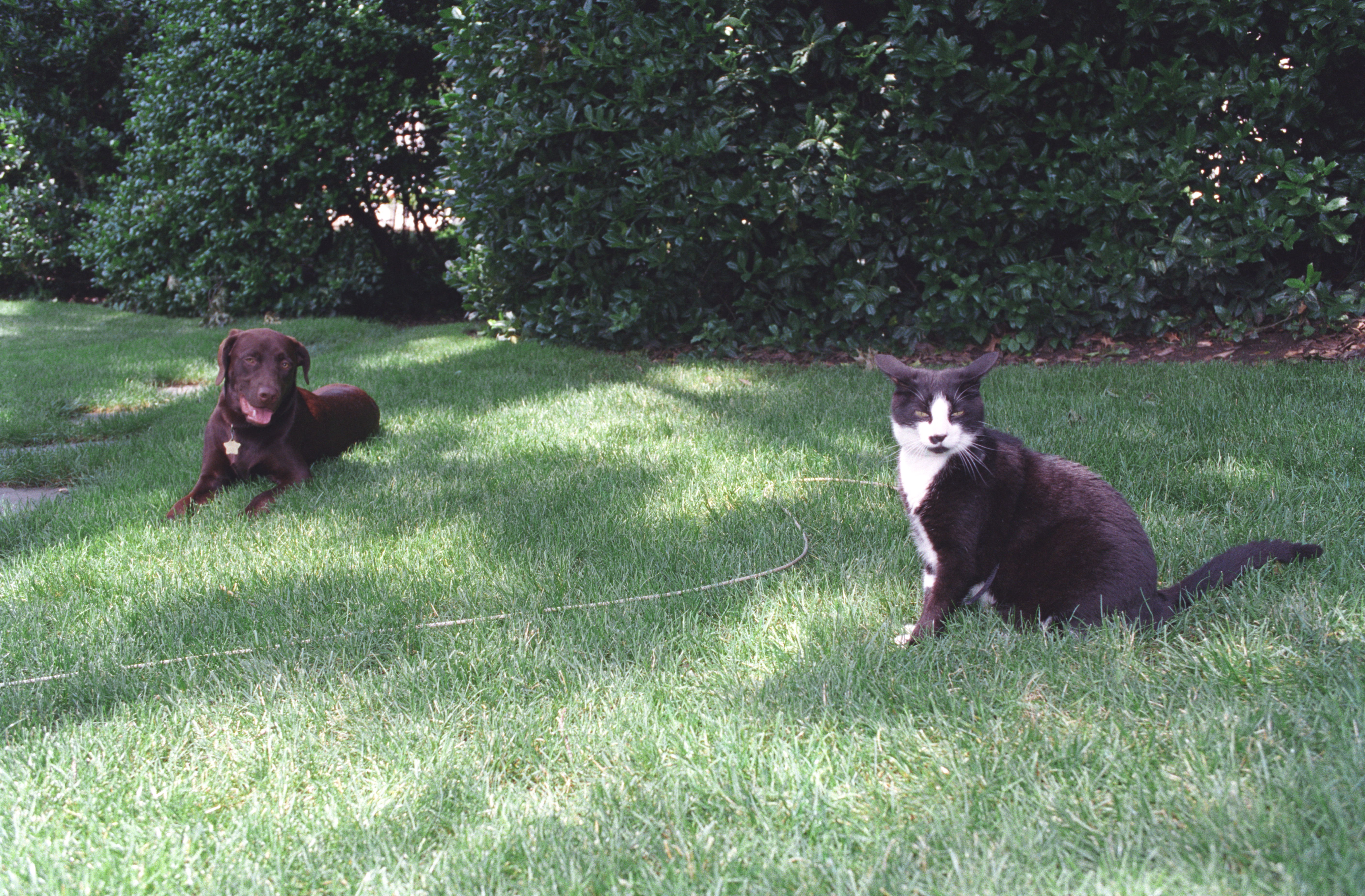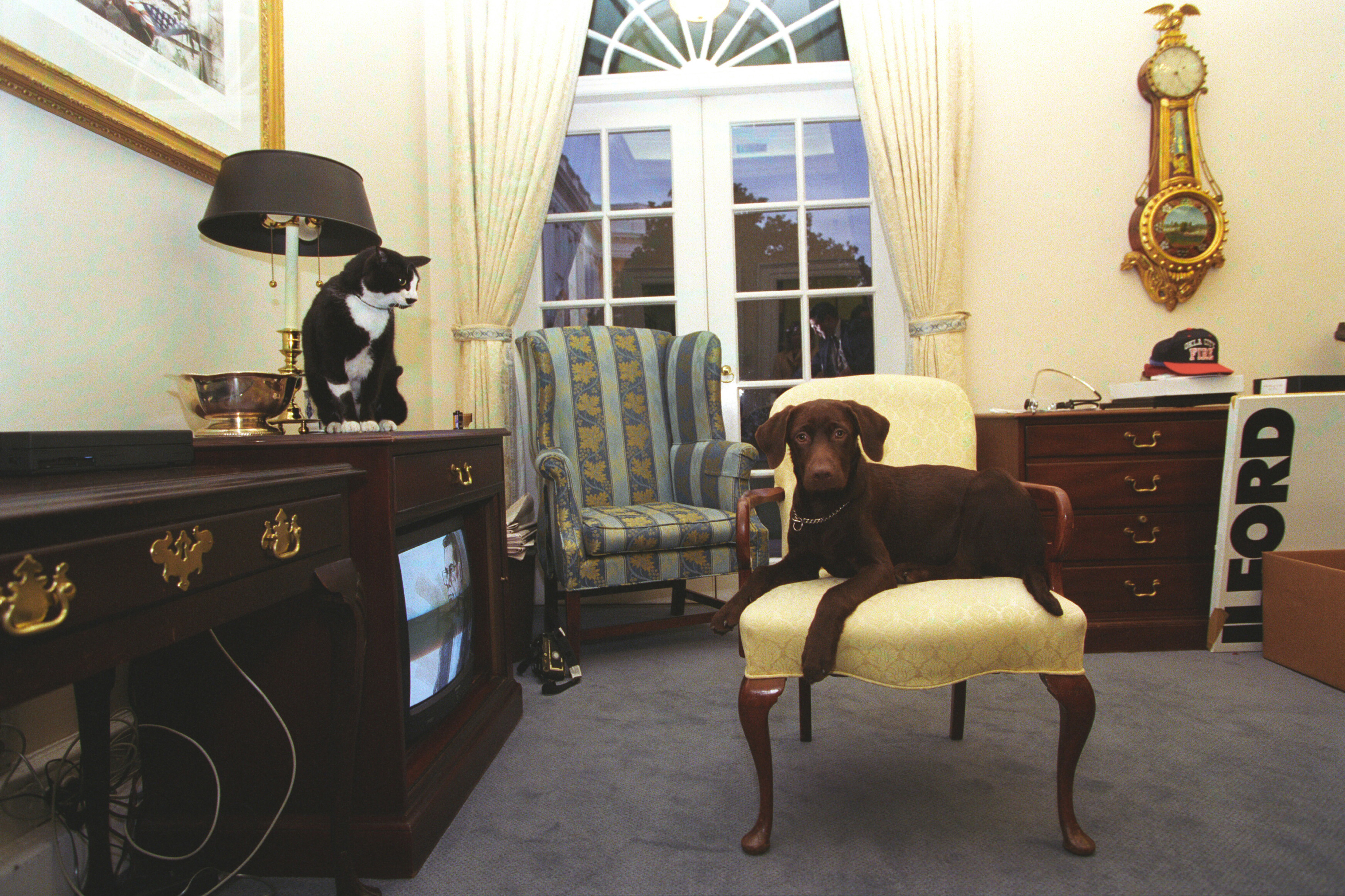 Socks the cat and Buddy the dog stare at one another while Betty Currie speaks on the telephone in the Outer Oval Office of the White House, January 1...Read moreSocks the cat and Buddy the dog stare at one another while Betty Currie speaks on the telephone in the Outer Oval Office of the White House, January 15, 1998, Photographer: Barbara Kinney. Read lessP59679-19