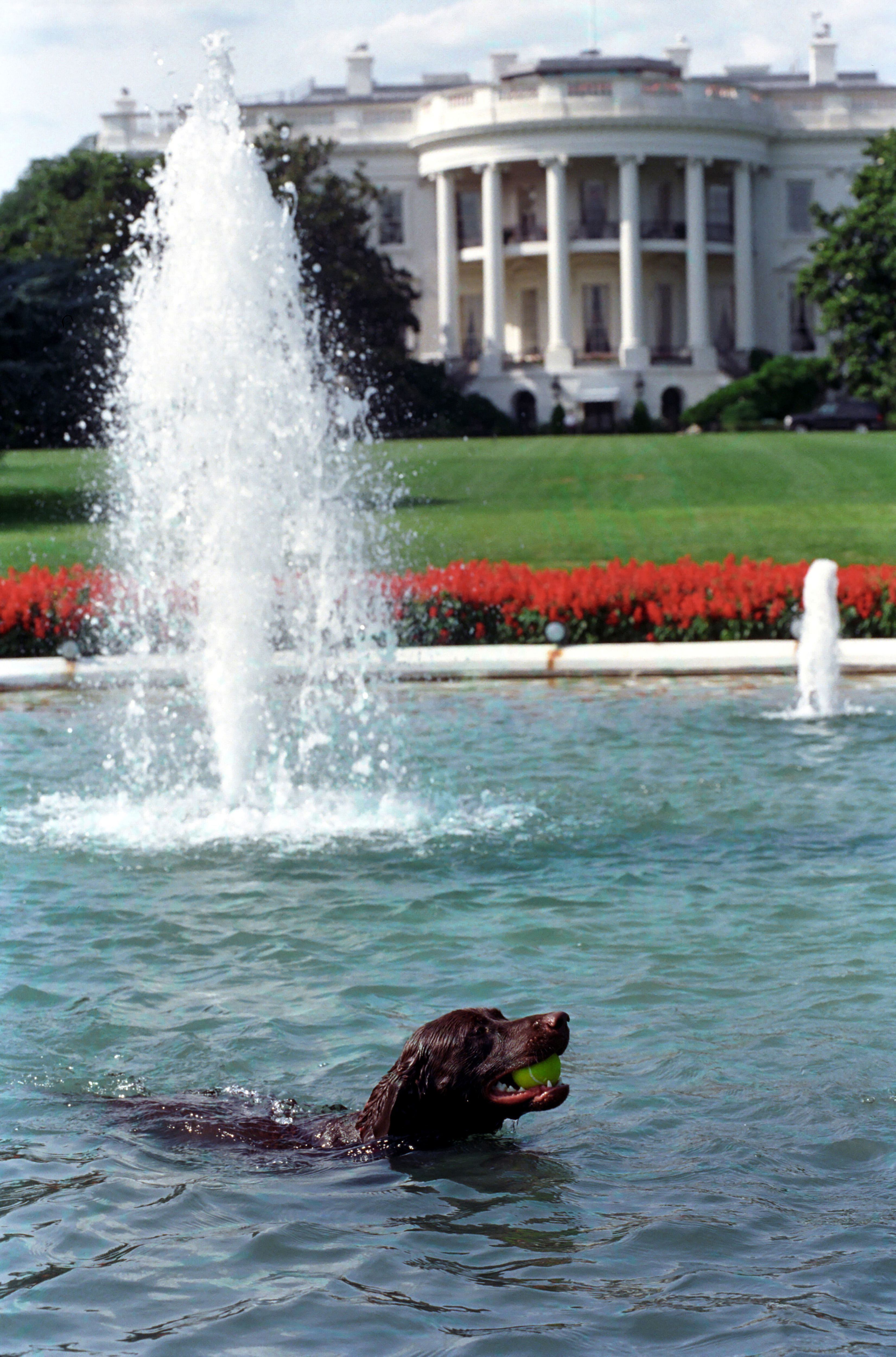 Buddy the dog sits for his official portrait on the South Lawn of the White House, April 22, 1998, Photographer: Barbara Kinney.P62519-12