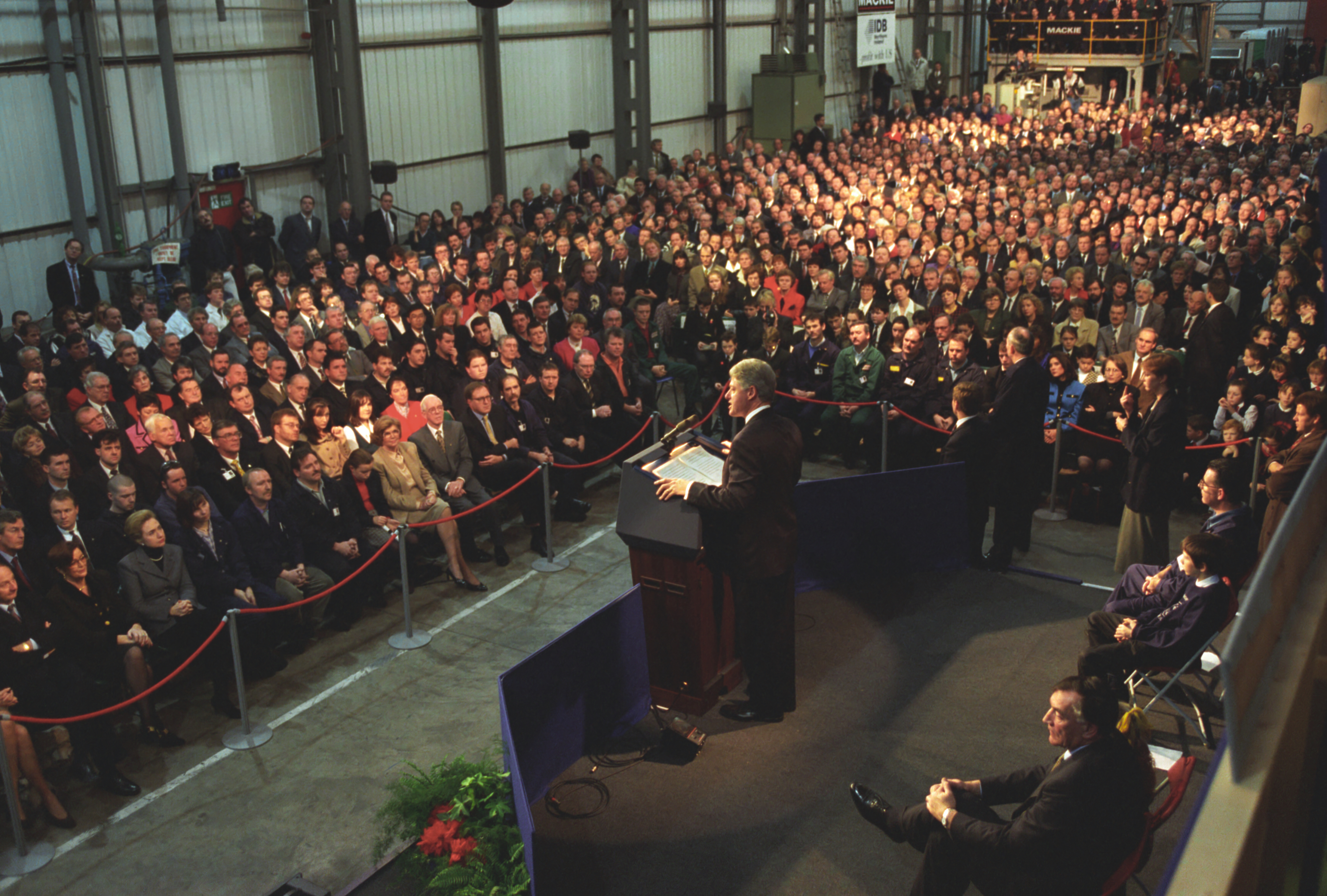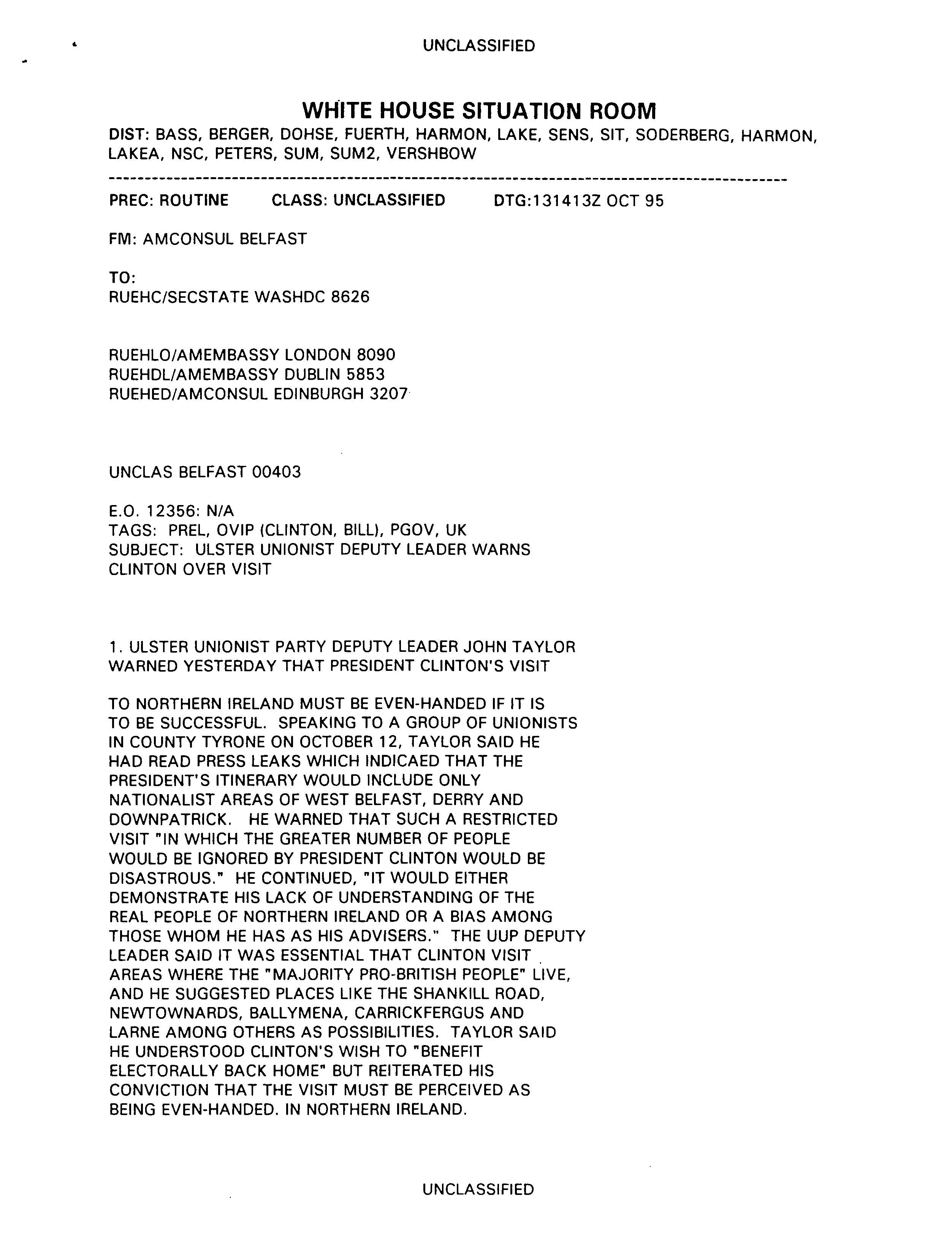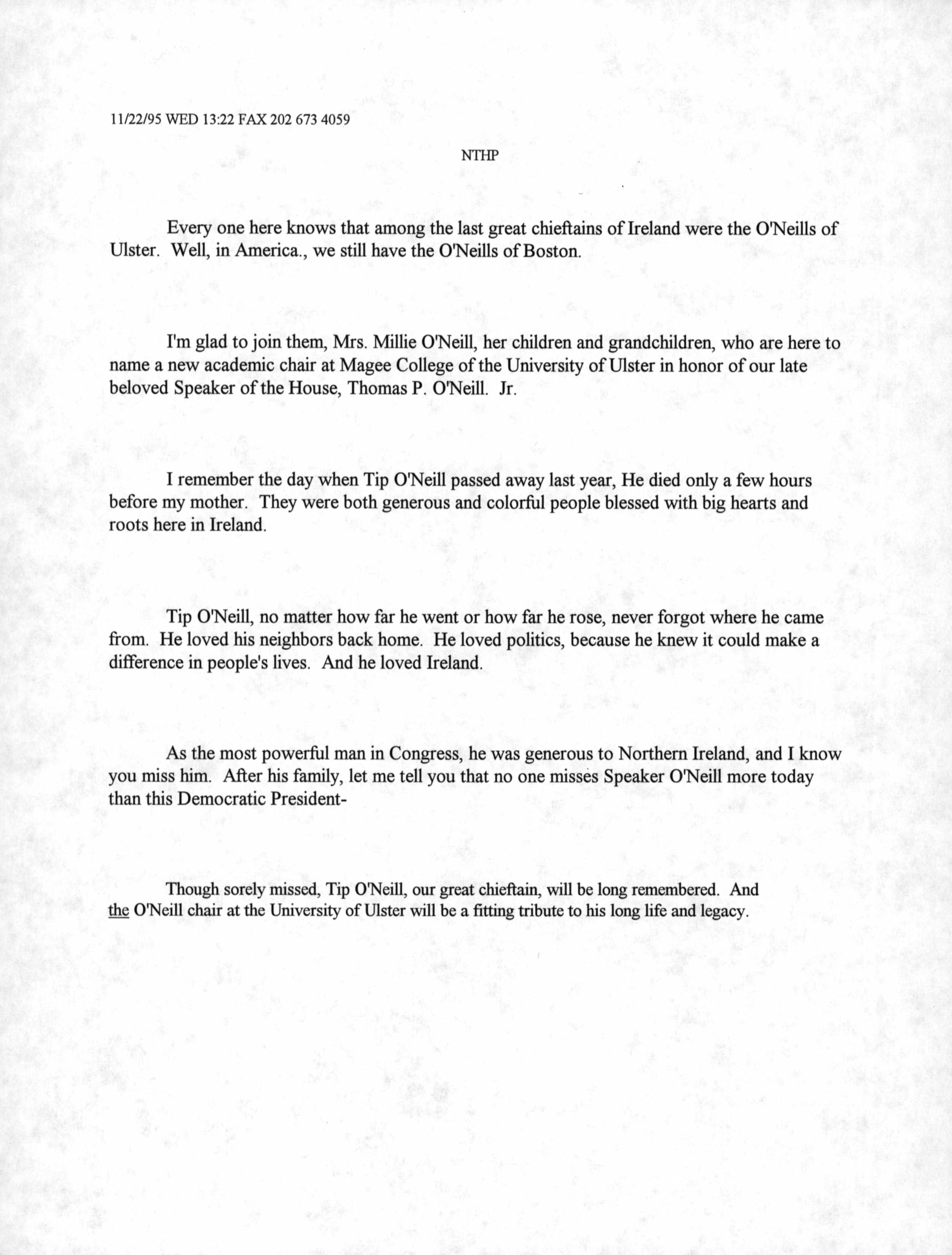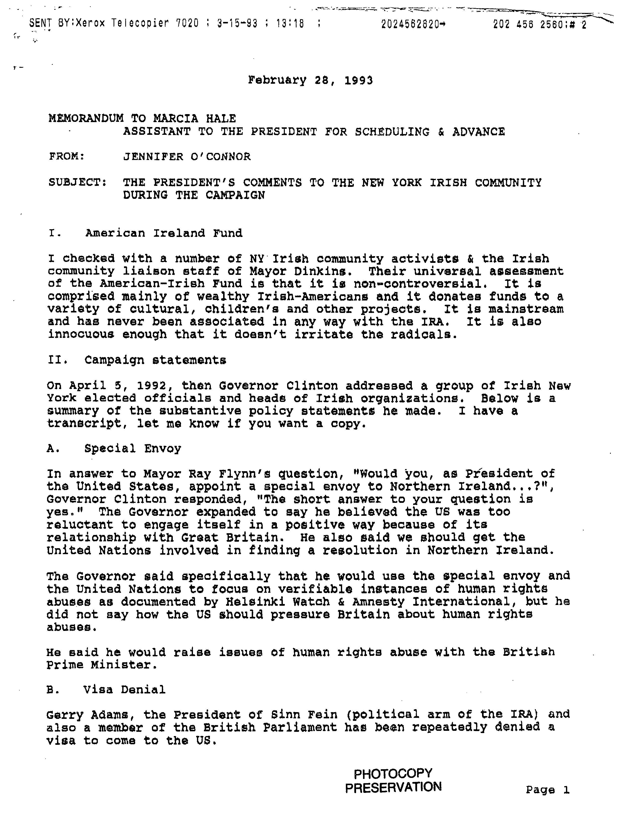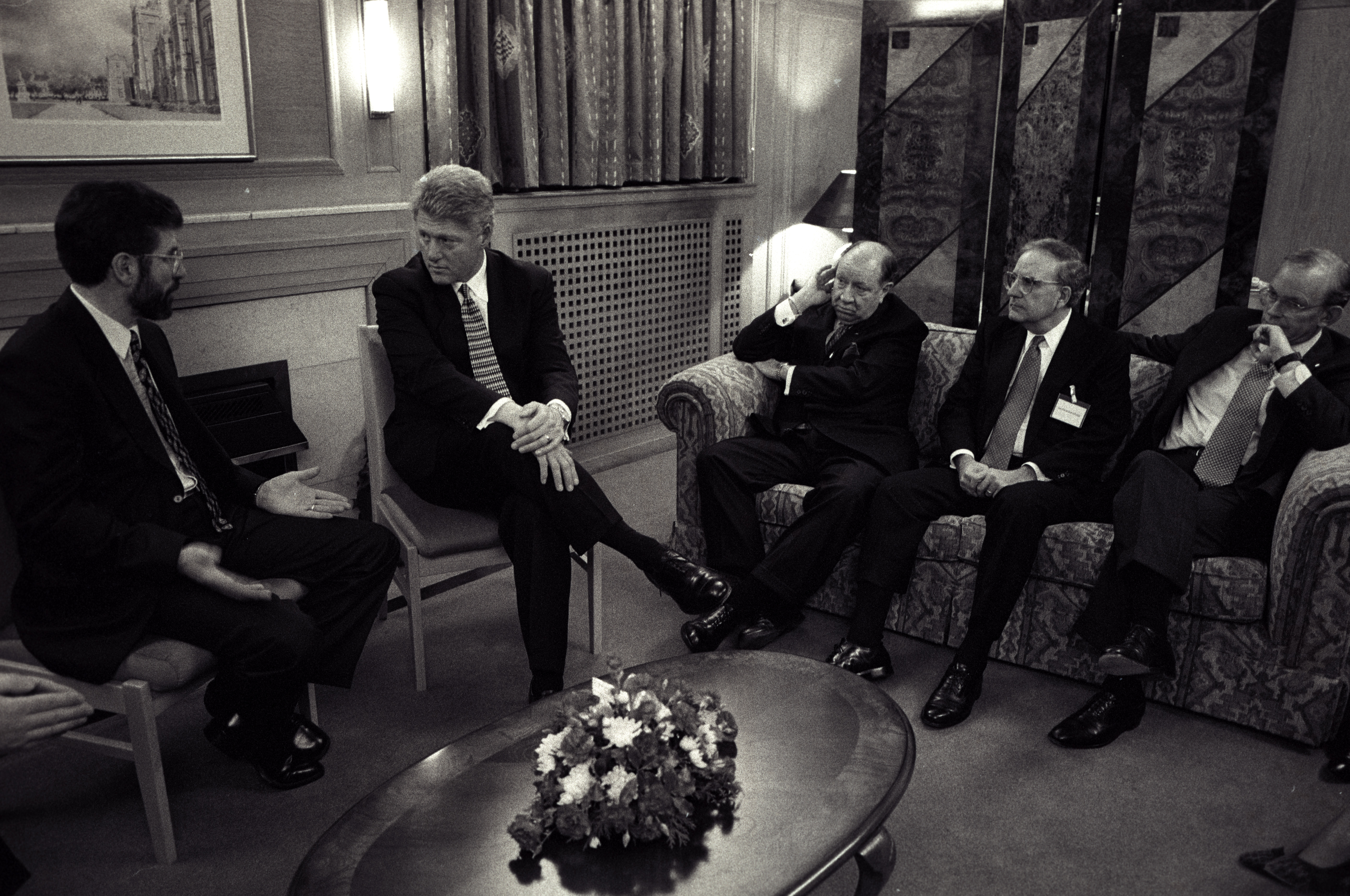 Helping bring peace to Northern Ireland was one of the lasting achievements of the Clinton Administration. When President Clinton assumed office in 1993, the conflict between the Protestant and Catholic communities in this province of the United Kingdom had claimed over three thousand lives. In 1998, aided in part by President Clinton's unceasing efforts, Protestant and Catholic political parties signed the Good Friday Agreement with the British and Irish governments. This ended thirty years of violent sectarian conflict. While behind-the-scenes negotiations were critical to securing this legal settlement, most observers agree that President Clinton’s travels to Northern Ireland were crucial to the success of the peace process. During three trips to Northern Ireland with First Lady Hillary Rodham Clinton, the President spoke with residents on the streets and in the factories and city squares. They met with entrepreneurs and fruit shop owners, textile workers, housewives, and school children from both religious faiths. The First Couple also met with the victims of terrorism and their families. View the President's Daily Schedule for November 30, 1995 President Clinton shakes hands with people in the crowd at Guildhall Square, Londonderry, Northern Ireland, November 30, 1995, Photographer: Sharon Farmer. President Clinton shakes hands with people in the crowd at Guildhall Square, Londonderry, Northern Ireland, November 30, 1995, Photographer: Sharon Farmer. The Decision to get Involved Campaign Platform “I first got involved in the Irish issue because of the politics of New York, but it became one of the great passions of my presidency.”President Bill Clinton, My Life, p. 401 As a Presidential Candidate, Governor Bill Clinton first announced his intention to help promote peace in Northern Ireland at a 1992 Irish-American Democratic Candidates Forum. Clinton promised that, if elected, he would appoint a special envoy to assist the British and Irish governments’ stalled efforts to end the “Troubles”: a complex ethno-nationalist conflict between Northern Ireland’s Protestant and Catholic communities marked by economic stagnation, human rights abuses, and terrorism. The “Troubles” modern origins lay in the Catholic civil rights movement of the late 1960s, but its roots are long, deep, and centuries old. In a widely circulated follow-up letter to prominent Irish-American Congressman Bruce Morrison, Governor Clinton reaffirmed his commitment to appointing a special envoy for Northern Ireland. First page of a letter to Bruce Morrison from President-elect Bill Clinton thanking him for his support as Chairman of the Irish-Americans for Clinton/Gore campaign, October 23, 1992. View in the National Archives Catalog First page of a letter to Bruce Morrison from President-elect Bill Clinton thanking him for his support as Chairman of the Irish-Americans for Clinton/Gore campaign, October 23, 1992. President Clinton participates in a bilateral meeting with Northern Ireland Ulster Unionist Party leader David Trimble in Belfast, Northern Ireland, November 30, 1995, Photographer: Robert McNeely, President Clinton participates in a bilateral meeting with Northern Ireland Ulster Unionist Party leader David Trimble in Belfast, Northern Ireland, November 30, 1995, Photographer: Robert McNeely, Political and Religious Divisions Northern Ireland is the smallest province of the United Kingdom, both in size and population: less than two million people live there. In 1992, approximately 55% of residents were Protestant and 45% Catholic. “Ulster” is the ancient name for most of the counties making up this region. At the time of President Clinton’s inauguration in 1993, there were five major political parties in Northern Ireland: the long dominant Protestant-majority Ulster Unionist Party; the militantly Loyalist Democratic Unionist Party led by Rev. Ian Paisley; the non-sectarian centrist Alliance Party; the Catholic-majority Social Democratic & Labor Party cofounded by John Hume; and Sinn Féin, the party associated with the Irish Republican Army. The Kennedy Family After his election, President Clinton also received the support of the Kennedy family for his efforts on behalf of peace in Northern Ireland. Senator Edward Kennedy provided advice and encouraged the White House to hire Nancy Soderberg, his staff expert on Northern Ireland. Soderberg was subsequently placed on the National Security Council (NSC) and became a key adviser throughout the peace process. Her office files are an essential archival resource. On Saint Patrick’s Day in 1993, Clinton also appointed Jean Kennedy Smith as Ambassador to the Republic of Ireland, where she became an active player during behind-the-scenes negotiations. View Nancy Soderberg's digitized files concerning Northern Ireland For more information on President Kennedy’s 1963 trip to Ireland, see the John F. Kennedy Presidential Library & Museum’s online exhibit, “A Journey Home: John F. Kennedy in Ireland.” Watch President Clinton's remarks at the dedication of the John F. Kennedy Jr. Presidential Library President Clinton and Sen. Ted Kennedy view exhibits at the John F. Kennedy Presidential Library & Museum in Boston, Massachusetts, October 29, 1993, Photographer: Robert McNeely. View in the National Archives Catalog President Clinton and Sen. Ted Kennedy view exhibits at the John F. Kennedy Presidential Library & Museum in Boston, Massachusetts, October 29, 1993, Photographer: Robert McNeely. First page of a memorandum to Marcia Hale from Jennifer O'Connor concerning "The President's Comments to the New York Irish Community during the Campaign." February 28, 1993. View in the National Archives Catalog First page of a memorandum to Marcia Hale from Jennifer O'Connor concerning "The President's Comments to the New York Irish Community during the Campaign." February 28, 1993. Sinn Féin and Gerry Adams While leaders from each party made importa