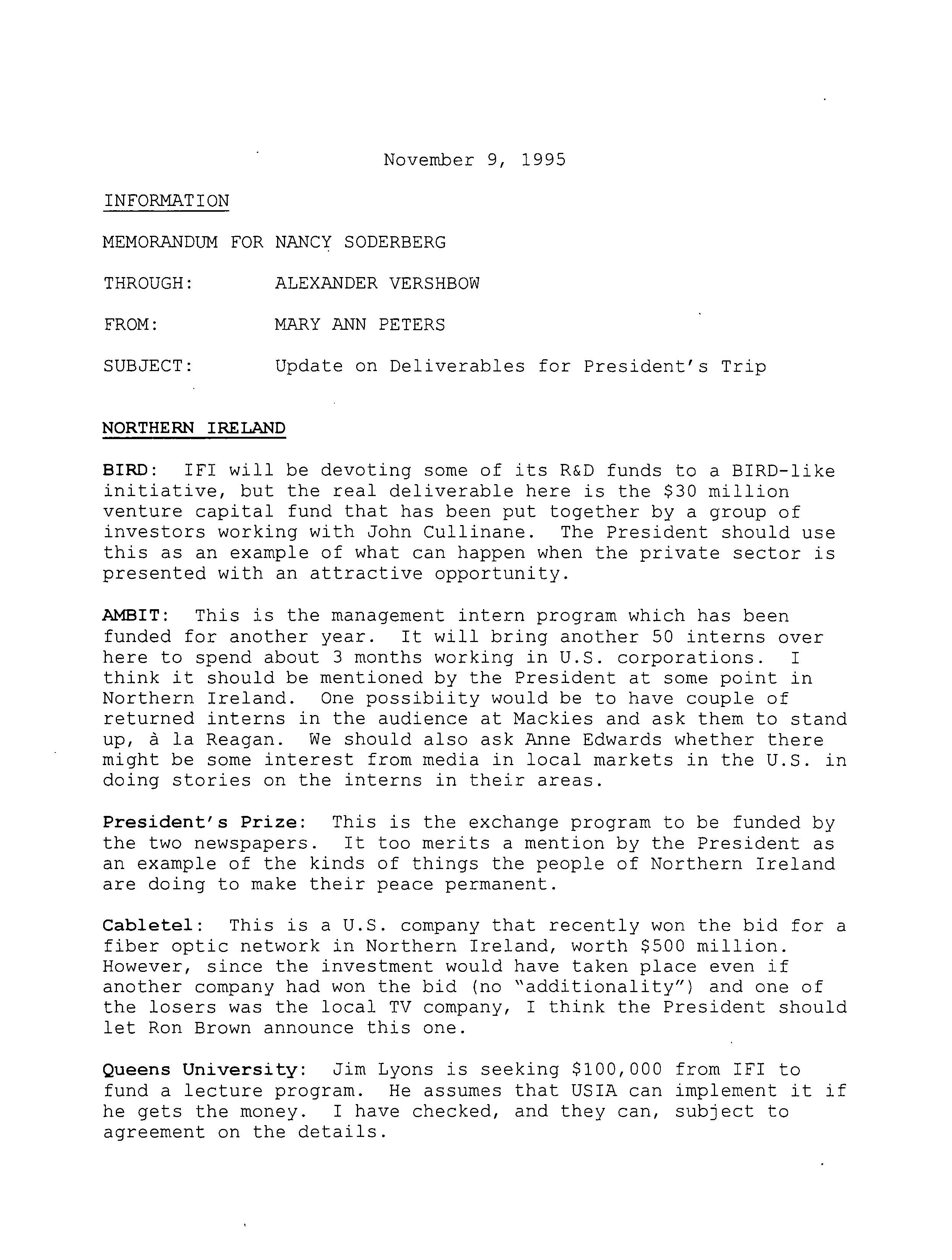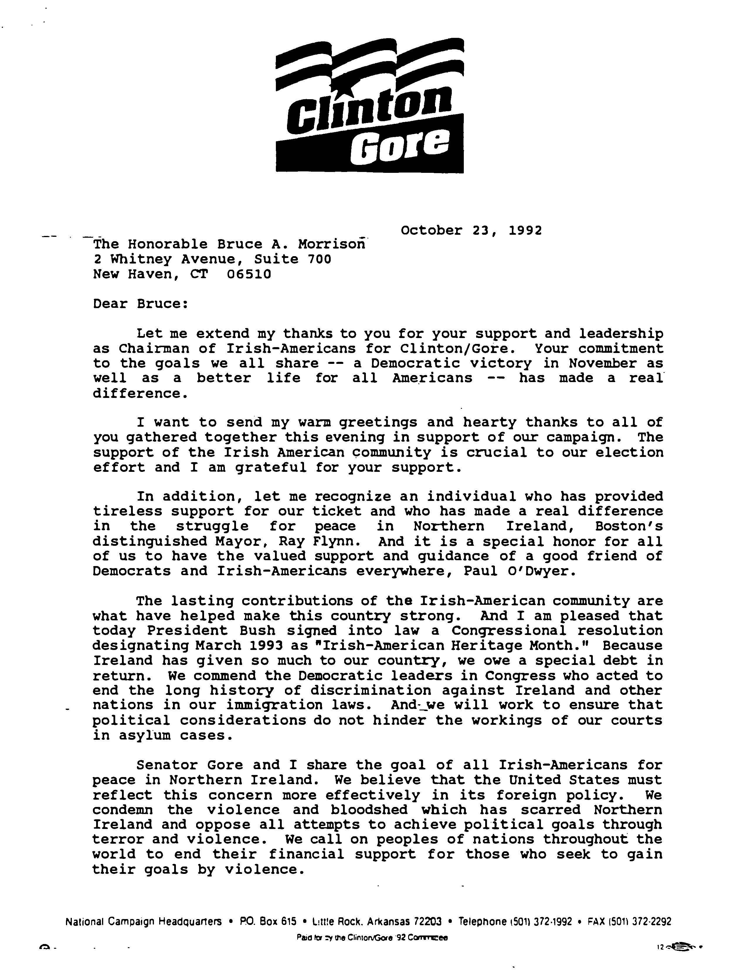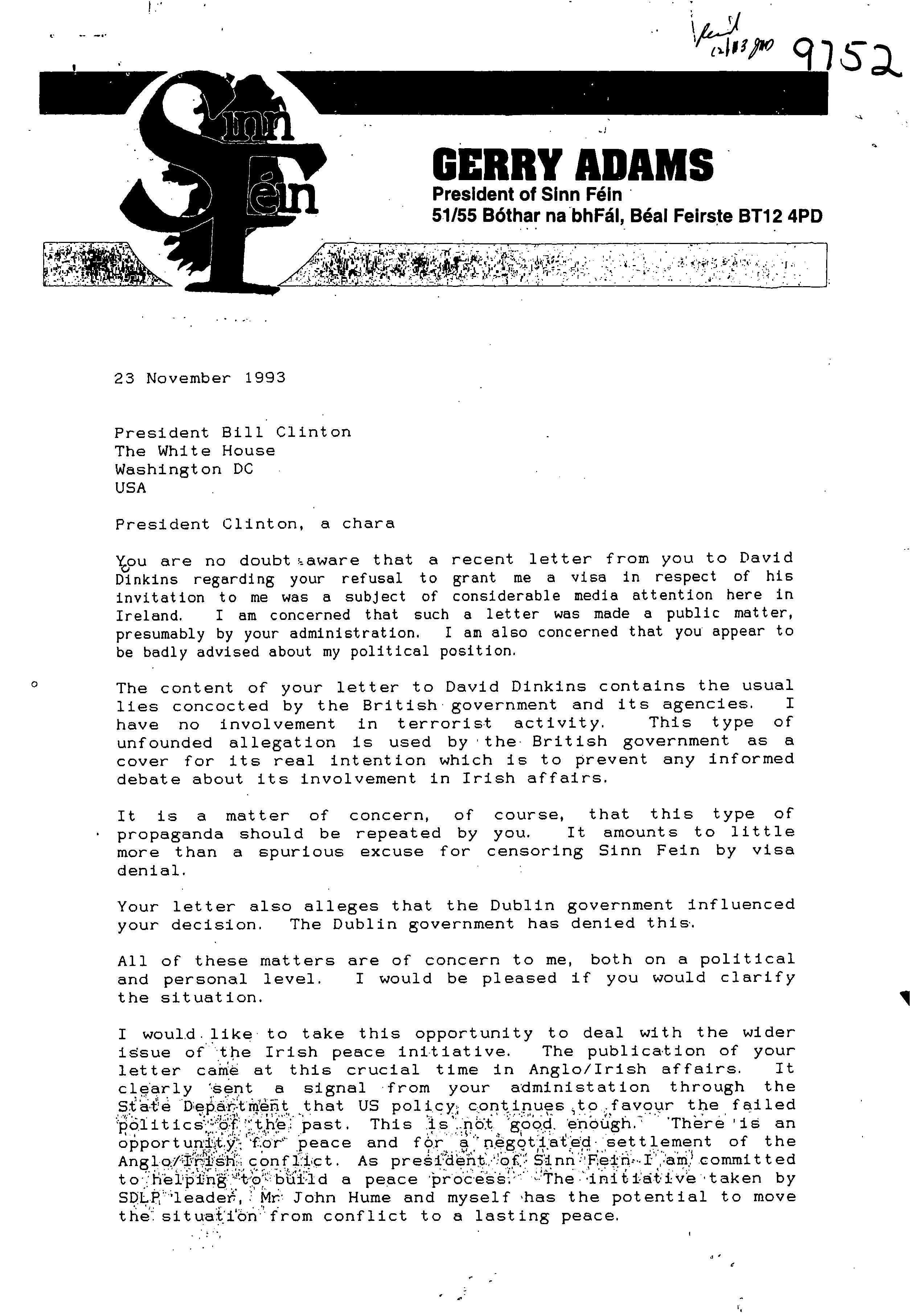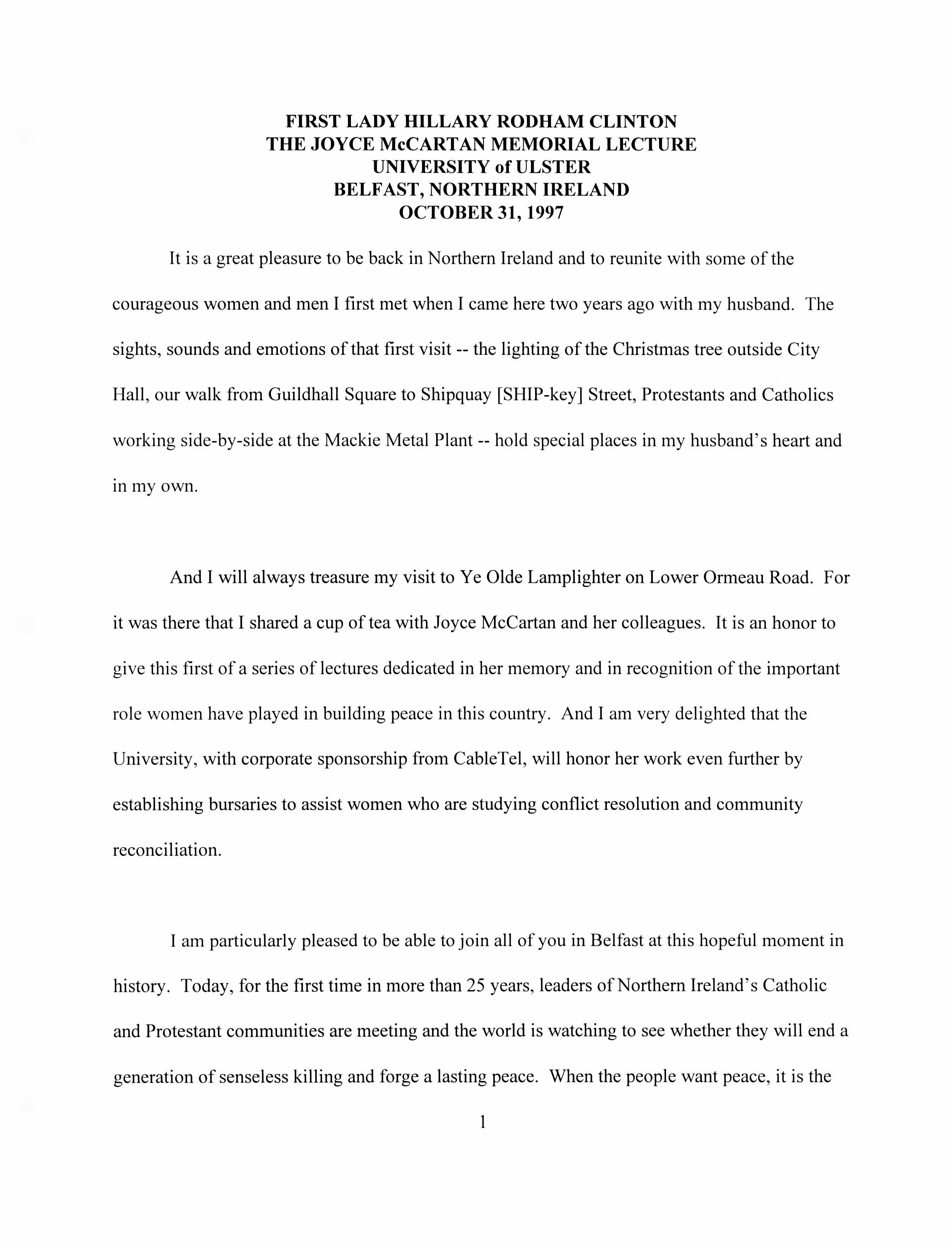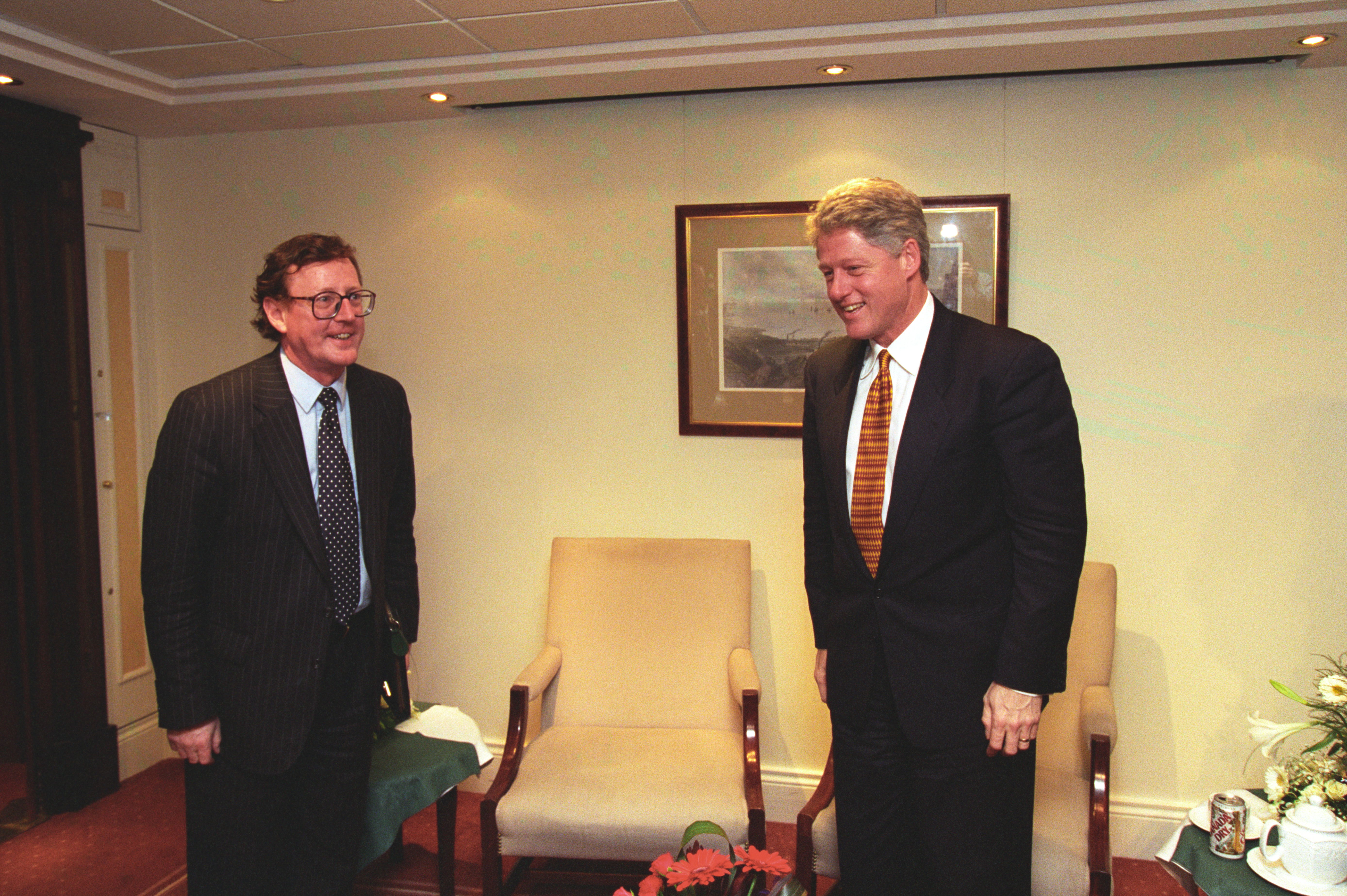 Helping bring peace to Northern Ireland was one of the lasting achievements of the Clinton Administration. When President Clinton assumed office in 1993, the conflict between the Protestant and Catholic communities in this province of the United Kingdom had claimed over three thousand lives. In 1998, aided in part by President Clinton's unceasing efforts, Protestant and Catholic political parties signed the Good Friday Agreement with the British and Irish governments. This ended thirty years of violent sectarian conflict. While behind-the-scenes negotiations were critical to securing this legal settlement, most observers agree that President Clinton’s travels to Northern Ireland were crucial to the success of the peace process. During three trips to Northern Ireland with First Lady Hillary Rodham Clinton, the President spoke with residents on the streets and in the factories and city squares. They met with entrepreneurs and fruit shop owners, textile workers, housewives, and school children from both religious faiths. The First Couple also met with the victims of terrorism and their families. View the President's Daily Schedule for November 30, 1995 President Clinton shakes hands with people in the crowd at Guildhall Square, Londonderry, Northern Ireland, November 30, 1995, Photographer: Sharon Farmer. President Clinton shakes hands with people in the crowd at Guildhall Square, Londonderry, Northern Ireland, November 30, 1995, Photographer: Sharon Farmer. The Decision to get Involved Campaign Platform “I first got involved in the Irish issue because of the politics of New York, but it became one of the great passions of my presidency.”President Bill Clinton, My Life, p. 401 As a Presidential Candidate, Governor Bill Clinton first announced his intention to help promote peace in Northern Ireland at a 1992 Irish-American Democratic Candidates Forum. Clinton promised that, if elected, he would appoint a special envoy to assist the British and Irish governments’ stalled efforts to end the “Troubles”: a complex ethno-nationalist conflict between Northern Ireland’s Protestant and Catholic communities marked by economic stagnation, human rights abuses, and terrorism. The “Troubles” modern origins lay in the Catholic civil rights movement of the late 1960s, but its roots are long, deep, and centuries old. In a widely circulated follow-up letter to prominent Irish-American Congressman Bruce Morrison, Governor Clinton reaffirmed his commitment to appointing a special envoy for Northern Ireland. First page of a letter to Bruce Morrison from President-elect Bill Clinton thanking him for his support as Chairman of the Irish-Americans for Clinton/Gore campaign, October 23, 1992. View in the National Archives Catalog First page of a letter to Bruce Morrison from President-elect Bill Clinton thanking him for his support as Chairman of the Irish-Americans for Clinton/Gore campaign, October 23, 1992. President Clinton participates in a bilateral meeting with Northern Ireland Ulster Unionist Party leader David Trimble in Belfast, Northern Ireland, November 30, 1995, Photographer: Robert McNeely, President Clinton participates in a bilateral meeting with Northern Ireland Ulster Unionist Party leader David Trimble in Belfast, Northern Ireland, November 30, 1995, Photographer: Robert McNeely, Political and Religious Divisions Northern Ireland is the smallest province of the United Kingdom, both in size and population: less than two million people live there. In 1992, approximately 55% of residents were Protestant and 45% Catholic. “Ulster” is the ancient name for most of the counties making up this region. At the time of President Clinton’s inauguration in 1993, there were five major political parties in Northern Ireland: the long dominant Protestant-majority Ulster Unionist Party; the militantly Loyalist Democratic Unionist Party led by Rev. Ian Paisley; the non-sectarian centrist Alliance Party; the Catholic-majority Social Democratic & Labor Party cofounded by John Hume; and Sinn Féin, the party associated with the Irish Republican Army. The Kennedy Family After his election, President Clinton also received the support of the Kennedy family for his efforts on behalf of peace in Northern Ireland. Senator Edward Kennedy provided advice and encouraged the White House to hire Nancy Soderberg, his staff expert on Northern Ireland. Soderberg was subsequently placed on the National Security Council (NSC) and became a key adviser throughout the peace process. Her office files are an essential archival resource. On Saint Patrick’s Day in 1993, Clinton also appointed Jean Kennedy Smith as Ambassador to the Republic of Ireland, where she became an active player during behind-the-scenes negotiations. View Nancy Soderberg's digitized files concerning Northern Ireland For more information on President Kennedy’s 1963 trip to Ireland, see the John F. Kennedy Presidential Library & Museum’s online exhibit, “A Journey Home: John F. Kennedy in Ireland.” Watch President Clinton's remarks at the dedication of the John F. Kennedy Jr. Presidential Library President Clinton and Sen. Ted Kennedy view exhibits at the John F. Kennedy Presidential Library & Museum in Boston, Massachusetts, October 29, 1993, Photographer: Robert McNeely. View in the National Archives Catalog President Clinton and Sen. Ted Kennedy view exhibits at the John F. Kennedy Presidential Library & Museum in Boston, Massachusetts, October 29, 1993, Photographer: Robert McNeely. First page of a memorandum to Marcia Hale from Jennifer O'Connor concerning "The President's Comments to the New York Irish Community during the Campaign." February 28, 1993. View in the National Archives Catalog First page of a memorandum to Marcia Hale from Jennifer O'Connor concerning "The President's Comments to the New York Irish Community during the Campaign." February 28, 1993. Sinn Féin and Gerry Adams While leaders from each party made importa