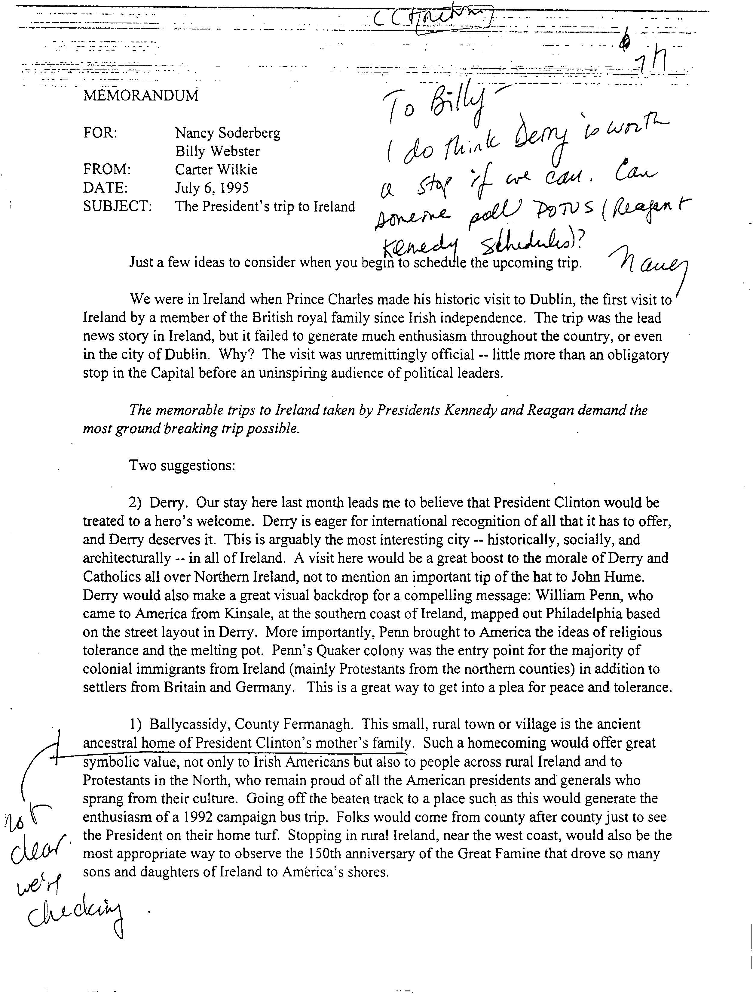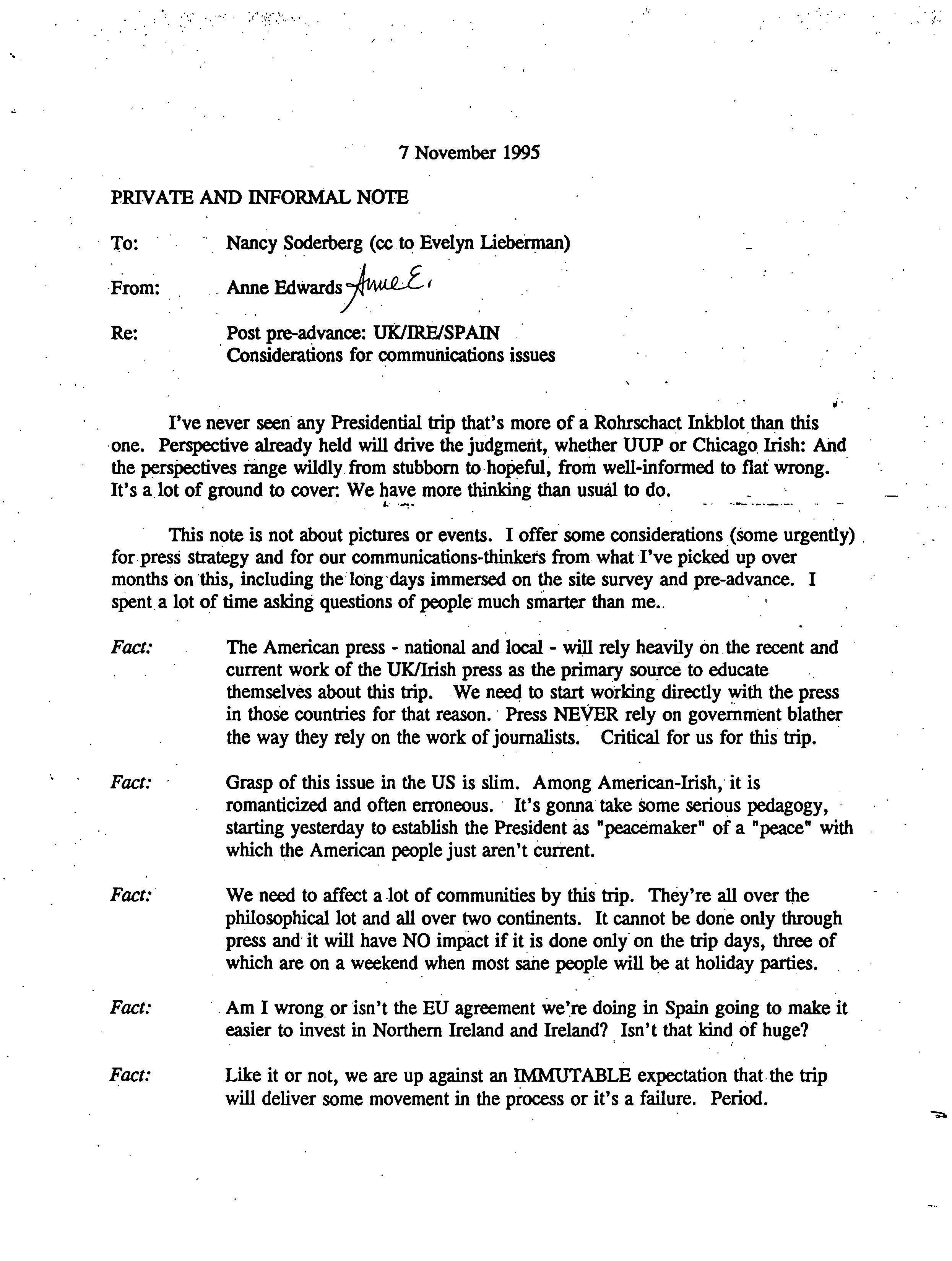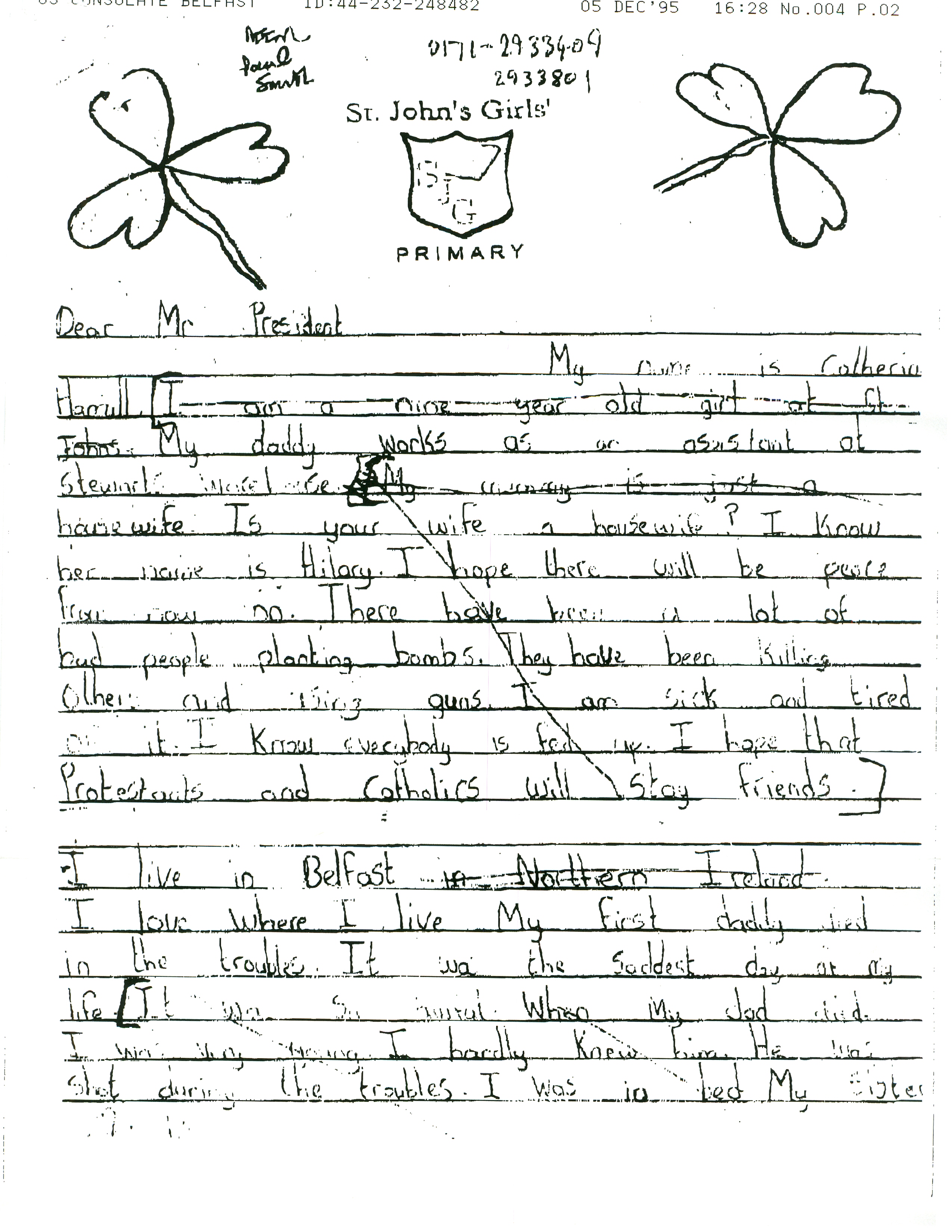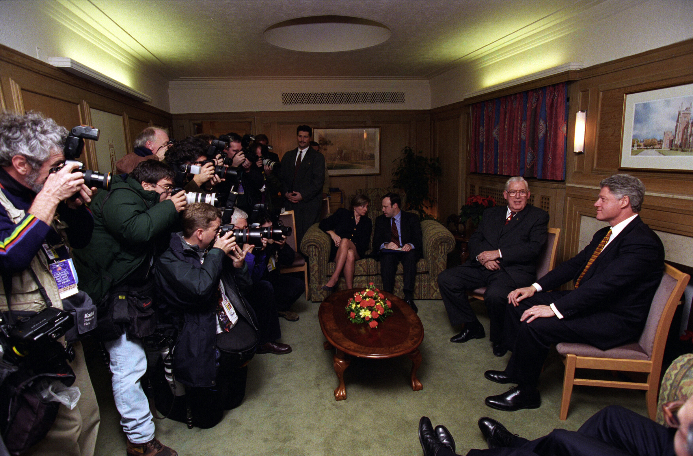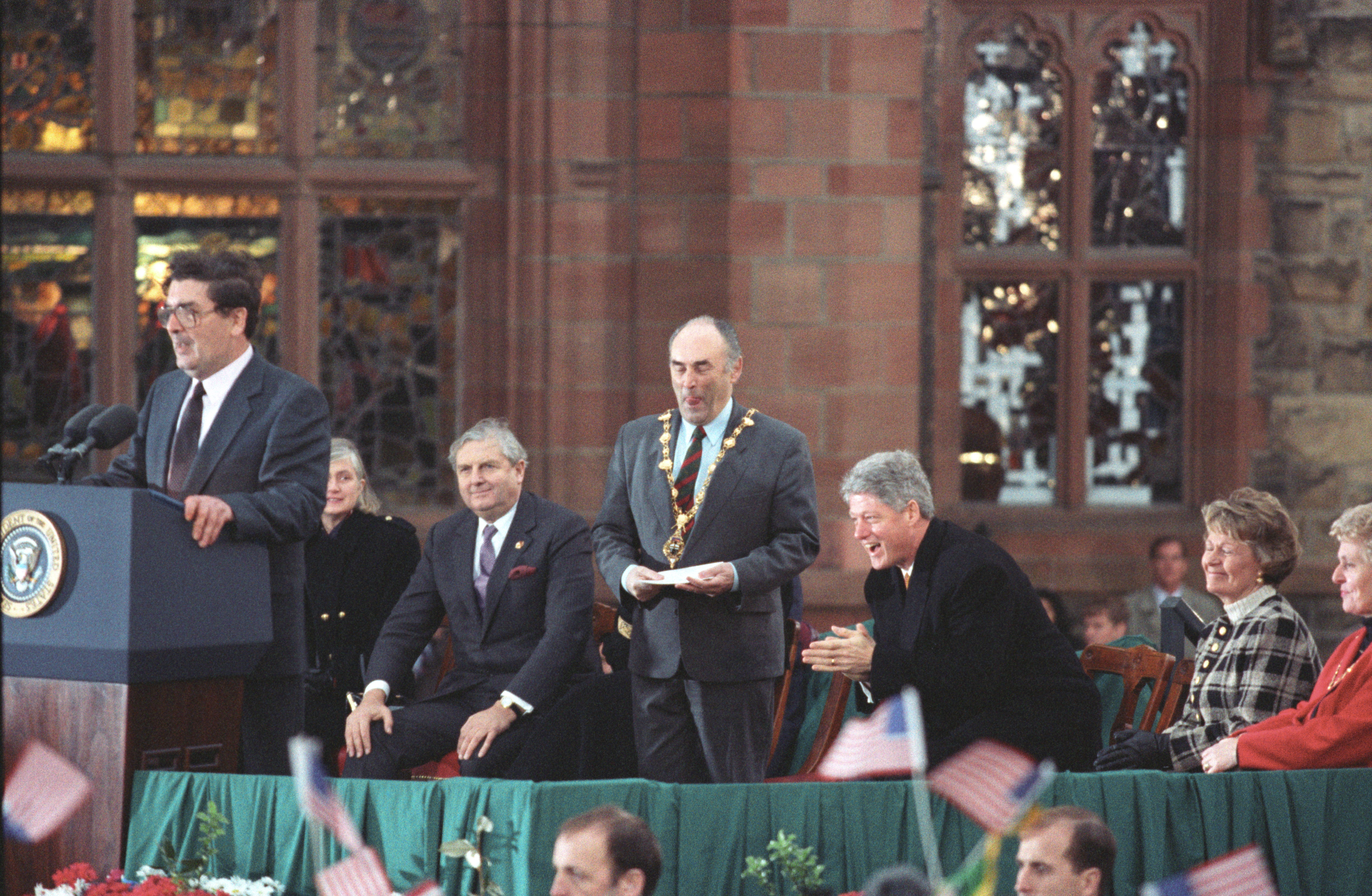 Helping bring peace to Northern Ireland was one of the lasting achievements of the Clinton Administration. When President Clinton assumed office in 1993, the conflict between the Protestant and Catholic communities in this province of the United Kingdom had claimed over three thousand lives. In 1998, aided in part by President Clinton's unceasing efforts, Protestant and Catholic political parties signed the Good Friday Agreement with the British and Irish governments. This ended thirty years of violent sectarian conflict. While behind-the-scenes negotiations were critical to securing this legal settlement, most observers agree that President Clinton’s travels to Northern Ireland were crucial to the success of the peace process. During three trips to Northern Ireland with First Lady Hillary Rodham Clinton, the President spoke with residents on the streets and in the factories and city squares. They met with entrepreneurs and fruit shop owners, textile workers, housewives, and school children from both religious faiths. The First Couple also met with the victims of terrorism and their families. View the President's Daily Schedule for November 30, 1995 President Clinton shakes hands with people in the crowd at Guildhall Square, Londonderry, Northern Ireland, November 30, 1995, Photographer: Sharon Farmer. President Clinton shakes hands with people in the crowd at Guildhall Square, Londonderry, Northern Ireland, November 30, 1995, Photographer: Sharon Farmer. The Decision to get Involved Campaign Platform “I first got involved in the Irish issue because of the politics of New York, but it became one of the great passions of my presidency.”President Bill Clinton, My Life, p. 401 As a Presidential Candidate, Governor Bill Clinton first announced his intention to help promote peace in Northern Ireland at a 1992 Irish-American Democratic Candidates Forum. Clinton promised that, if elected, he would appoint a special envoy to assist the British and Irish governments’ stalled efforts to end the “Troubles”: a complex ethno-nationalist conflict between Northern Ireland’s Protestant and Catholic communities marked by economic stagnation, human rights abuses, and terrorism. The “Troubles” modern origins lay in the Catholic civil rights movement of the late 1960s, but its roots are long, deep, and centuries old. In a widely circulated follow-up letter to prominent Irish-American Congressman Bruce Morrison, Governor Clinton reaffirmed his commitment to appointing a special envoy for Northern Ireland. First page of a letter to Bruce Morrison from President-elect Bill Clinton thanking him for his support as Chairman of the Irish-Americans for Clinton/Gore campaign, October 23, 1992. View in the National Archives Catalog First page of a letter to Bruce Morrison from President-elect Bill Clinton thanking him for his support as Chairman of the Irish-Americans for Clinton/Gore campaign, October 23, 1992. President Clinton participates in a bilateral meeting with Northern Ireland Ulster Unionist Party leader David Trimble in Belfast, Northern Ireland, November 30, 1995, Photographer: Robert McNeely, President Clinton participates in a bilateral meeting with Northern Ireland Ulster Unionist Party leader David Trimble in Belfast, Northern Ireland, November 30, 1995, Photographer: Robert McNeely, Political and Religious Divisions Northern Ireland is the smallest province of the United Kingdom, both in size and population: less than two million people live there. In 1992, approximately 55% of residents were Protestant and 45% Catholic. “Ulster” is the ancient name for most of the counties making up this region. At the time of President Clinton’s inauguration in 1993, there were five major political parties in Northern Ireland: the long dominant Protestant-majority Ulster Unionist Party; the militantly Loyalist Democratic Unionist Party led by Rev. Ian Paisley; the non-sectarian centrist Alliance Party; the Catholic-majority Social Democratic & Labor Party cofounded by John Hume; and Sinn Féin, the party associated with the Irish Republican Army. The Kennedy Family After his election, President Clinton also received the support of the Kennedy family for his efforts on behalf of peace in Northern Ireland. Senator Edward Kennedy provided advice and encouraged the White House to hire Nancy Soderberg, his staff expert on Northern Ireland. Soderberg was subsequently placed on the National Security Council (NSC) and became a key adviser throughout the peace process. Her office files are an essential archival resource. On Saint Patrick’s Day in 1993, Clinton also appointed Jean Kennedy Smith as Ambassador to the Republic of Ireland, where she became an active player during behind-the-scenes negotiations. View Nancy Soderberg's digitized files concerning Northern Ireland For more information on President Kennedy’s 1963 trip to Ireland, see the John F. Kennedy Presidential Library & Museum’s online exhibit, “A Journey Home: John F. Kennedy in Ireland.” Watch President Clinton's remarks at the dedication of the John F. Kennedy Jr. Presidential Library President Clinton and Sen. Ted Kennedy view exhibits at the John F. Kennedy Presidential Library & Museum in Boston, Massachusetts, October 29, 1993, Photographer: Robert McNeely. View in the National Archives Catalog President Clinton and Sen. Ted Kennedy view exhibits at the John F. Kennedy Presidential Library & Museum in Boston, Massachusetts, October 29, 1993, Photographer: Robert McNeely. First page of a memorandum to Marcia Hale from Jennifer O'Connor concerning "The President's Comments to the New York Irish Community during the Campaign." February 28, 1993. View in the National Archives Catalog First page of a memorandum to Marcia Hale from Jennifer O'Connor concerning "The President's Comments to the New York Irish Community during the Campaign." February 28, 1993. Sinn Féin and Gerry Adams While leaders from each party made importa