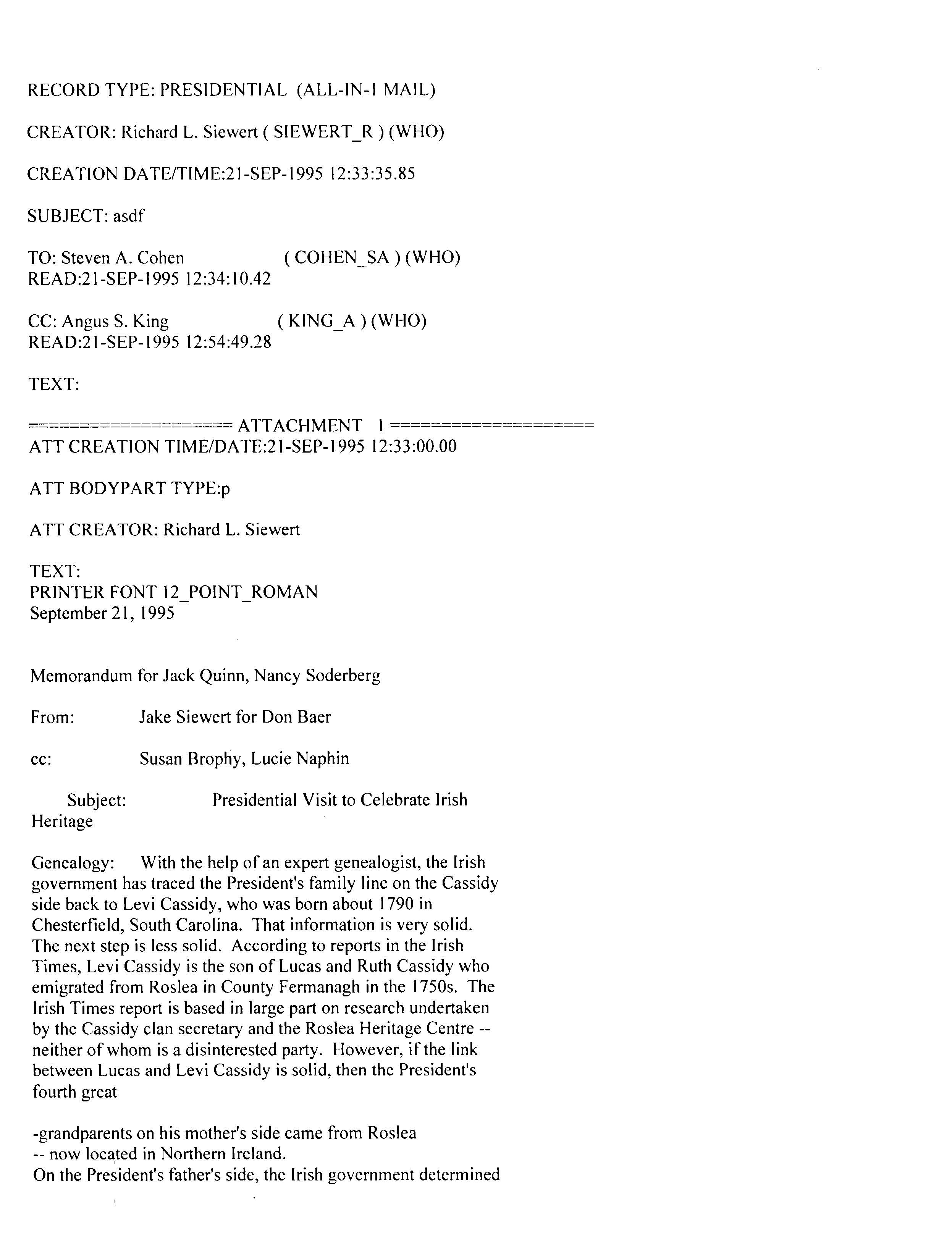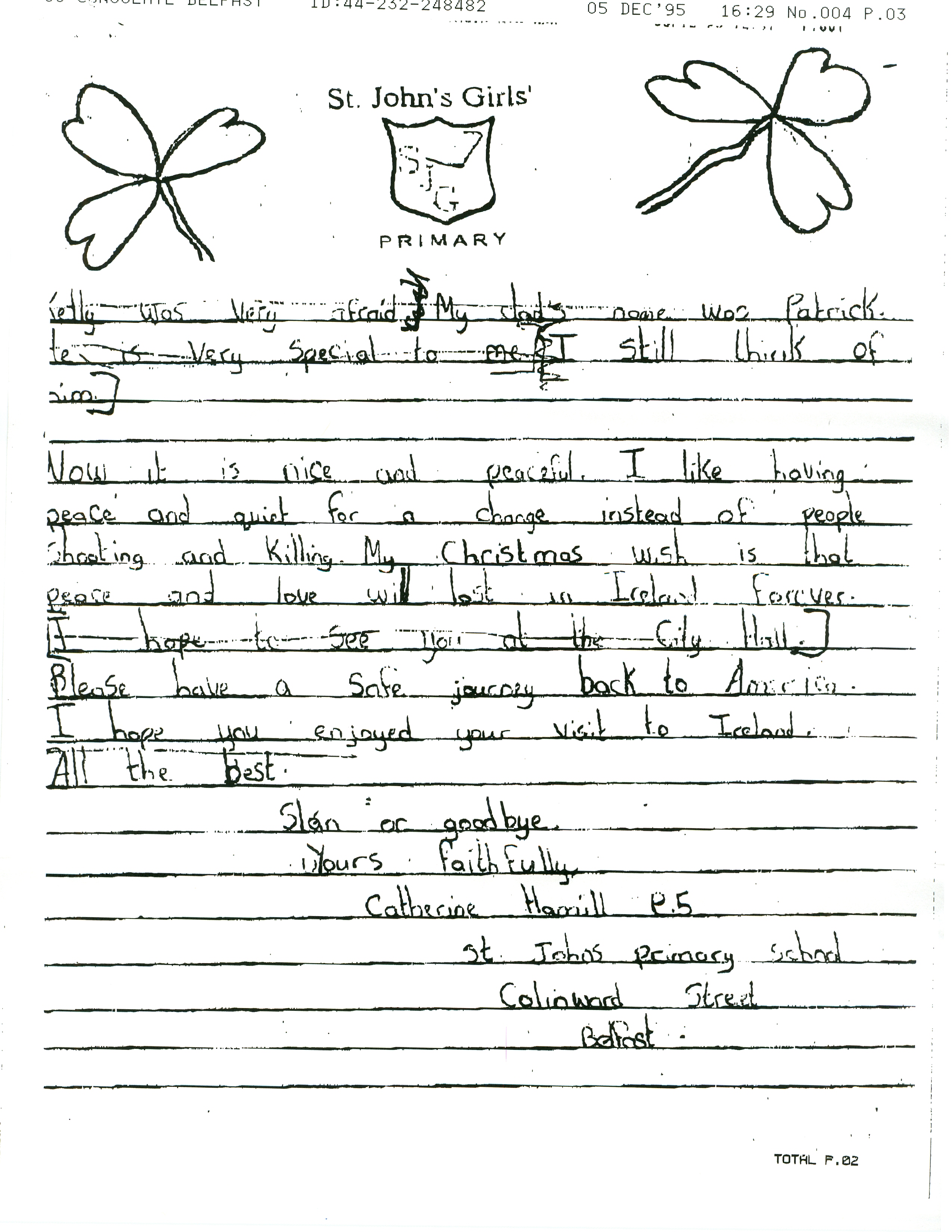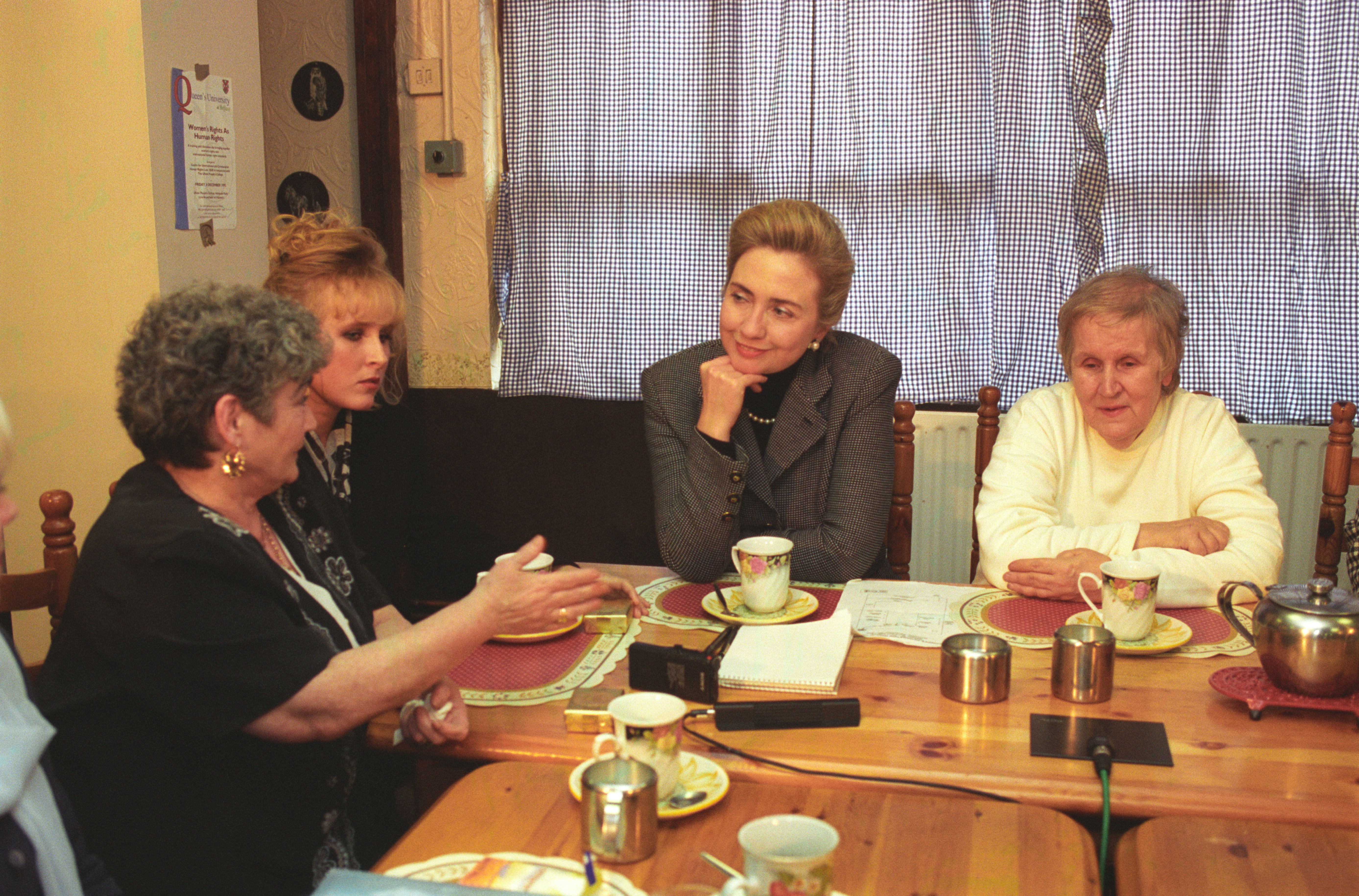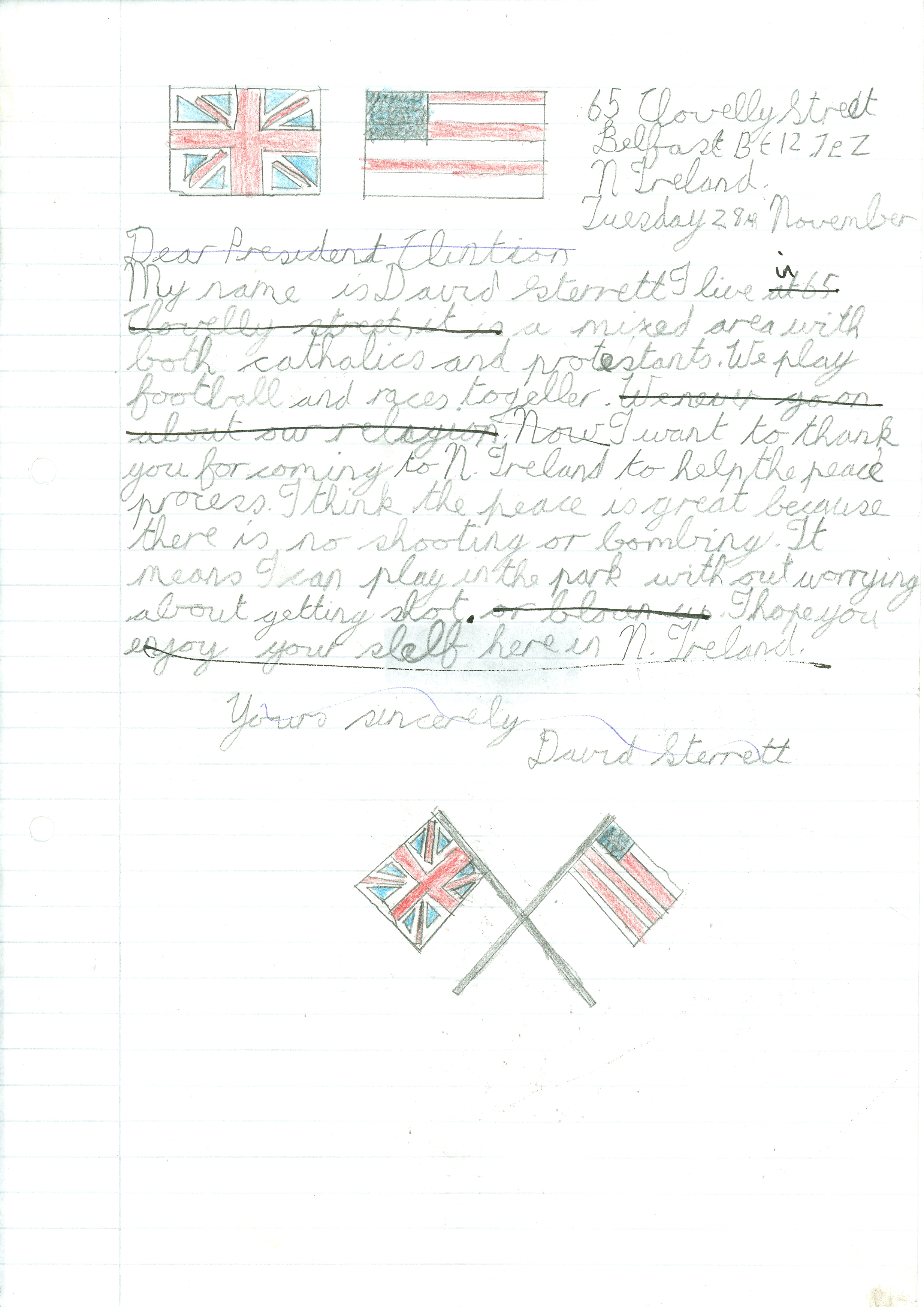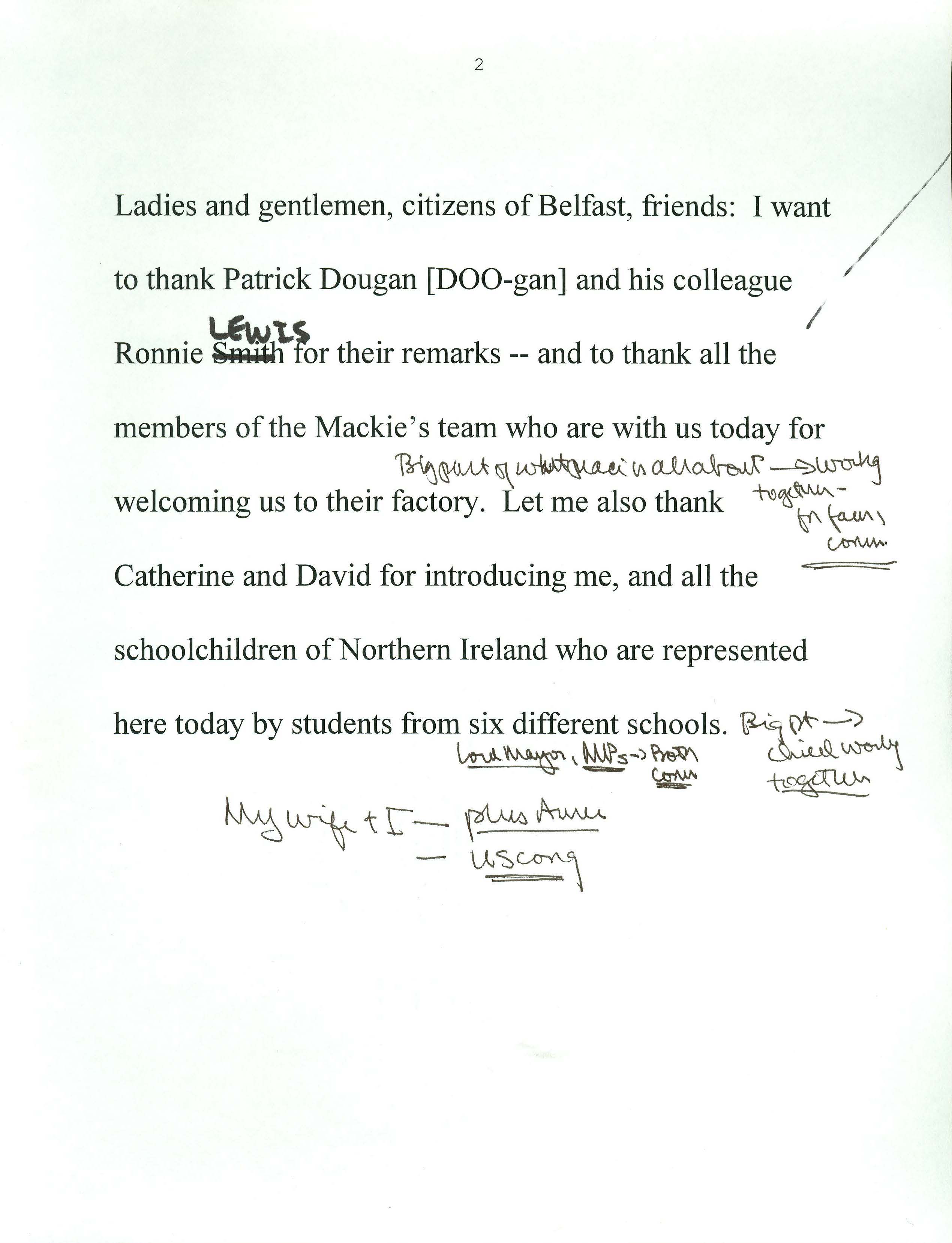 Helping bring peace to Northern Ireland was one of the lasting achievements of the Clinton Administration. When President Clinton assumed office in 1993, the conflict between the Protestant and Catholic communities in this province of the United Kingdom had claimed over three thousand lives. In 1998, aided in part by President Clinton's unceasing efforts, Protestant and Catholic political parties signed the Good Friday Agreement with the British and Irish governments. This ended thirty years of violent sectarian conflict. While behind-the-scenes negotiations were critical to securing this legal settlement, most observers agree that President Clinton’s travels to Northern Ireland were crucial to the success of the peace process. During three trips to Northern Ireland with First Lady Hillary Rodham Clinton, the President spoke with residents on the streets and in the factories and city squares. They met with entrepreneurs and fruit shop owners, textile workers, housewives, and school children from both religious faiths. The First Couple also met with the victims of terrorism and their families. View the President's Daily Schedule for November 30, 1995 President Clinton shakes hands with people in the crowd at Guildhall Square, Londonderry, Northern Ireland, November 30, 1995, Photographer: Sharon Farmer. President Clinton shakes hands with people in the crowd at Guildhall Square, Londonderry, Northern Ireland, November 30, 1995, Photographer: Sharon Farmer. The Decision to get Involved Campaign Platform “I first got involved in the Irish issue because of the politics of New York, but it became one of the great passions of my presidency.”President Bill Clinton, My Life, p. 401 As a Presidential Candidate, Governor Bill Clinton first announced his intention to help promote peace in Northern Ireland at a 1992 Irish-American Democratic Candidates Forum. Clinton promised that, if elected, he would appoint a special envoy to assist the British and Irish governments’ stalled efforts to end the “Troubles”: a complex ethno-nationalist conflict between Northern Ireland’s Protestant and Catholic communities marked by economic stagnation, human rights abuses, and terrorism. The “Troubles” modern origins lay in the Catholic civil rights movement of the late 1960s, but its roots are long, deep, and centuries old. In a widely circulated follow-up letter to prominent Irish-American Congressman Bruce Morrison, Governor Clinton reaffirmed his commitment to appointing a special envoy for Northern Ireland. First page of a letter to Bruce Morrison from President-elect Bill Clinton thanking him for his support as Chairman of the Irish-Americans for Clinton/Gore campaign, October 23, 1992. View in the National Archives Catalog First page of a letter to Bruce Morrison from President-elect Bill Clinton thanking him for his support as Chairman of the Irish-Americans for Clinton/Gore campaign, October 23, 1992. President Clinton participates in a bilateral meeting with Northern Ireland Ulster Unionist Party leader David Trimble in Belfast, Northern Ireland, November 30, 1995, Photographer: Robert McNeely, President Clinton participates in a bilateral meeting with Northern Ireland Ulster Unionist Party leader David Trimble in Belfast, Northern Ireland, November 30, 1995, Photographer: Robert McNeely, Political and Religious Divisions Northern Ireland is the smallest province of the United Kingdom, both in size and population: less than two million people live there. In 1992, approximately 55% of residents were Protestant and 45% Catholic. “Ulster” is the ancient name for most of the counties making up this region. At the time of President Clinton’s inauguration in 1993, there were five major political parties in Northern Ireland: the long dominant Protestant-majority Ulster Unionist Party; the militantly Loyalist Democratic Unionist Party led by Rev. Ian Paisley; the non-sectarian centrist Alliance Party; the Catholic-majority Social Democratic & Labor Party cofounded by John Hume; and Sinn Féin, the party associated with the Irish Republican Army. The Kennedy Family After his election, President Clinton also received the support of the Kennedy family for his efforts on behalf of peace in Northern Ireland. Senator Edward Kennedy provided advice and encouraged the White House to hire Nancy Soderberg, his staff expert on Northern Ireland. Soderberg was subsequently placed on the National Security Council (NSC) and became a key adviser throughout the peace process. Her office files are an essential archival resource. On Saint Patrick’s Day in 1993, Clinton also appointed Jean Kennedy Smith as Ambassador to the Republic of Ireland, where she became an active player during behind-the-scenes negotiations. View Nancy Soderberg's digitized files concerning Northern Ireland For more information on President Kennedy’s 1963 trip to Ireland, see the John F. Kennedy Presidential Library & Museum’s online exhibit, “A Journey Home: John F. Kennedy in Ireland.” Watch President Clinton's remarks at the dedication of the John F. Kennedy Jr. Presidential Library President Clinton and Sen. Ted Kennedy view exhibits at the John F. Kennedy Presidential Library & Museum in Boston, Massachusetts, October 29, 1993, Photographer: Robert McNeely. View in the National Archives Catalog President Clinton and Sen. Ted Kennedy view exhibits at the John F. Kennedy Presidential Library & Museum in Boston, Massachusetts, October 29, 1993, Photographer: Robert McNeely. First page of a memorandum to Marcia Hale from Jennifer O'Connor concerning "The President's Comments to the New York Irish Community during the Campaign." February 28, 1993. View in the National Archives Catalog First page of a memorandum to Marcia Hale from Jennifer O'Connor concerning "The President's Comments to the New York Irish Community during the Campaign." February 28, 1993. Sinn Féin and Gerry Adams While leaders from each party made importa