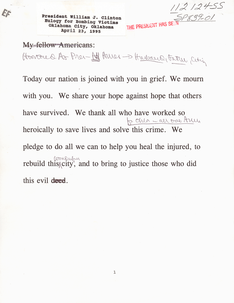 On the morning of April 19, 1995, former Army soldier and security guard Timothy McVeigh parked a Ryder truck with a homemade bomb in front of the building. McVeigh and his accomplice, former soldier Terry Nichols, had been radicalized by anti-government ideology. At 9:02 am, the bomb exploded. It destroyed a third of the structure and damaged up to 300 nearby buildings. A total of 168 people, including 19 children in the on-site daycare center, died in what remains the worst act of domestic terrorism in American history. In 1997, a jury convicted McVeigh and sentenced him to death. He died by lethal injection in 2001. Nichols was found guilty on conspiracy and manslaughter charges. In 2004, the state of Oklahoma convicted him on first degree murder charges and sentenced him to life in prison. A third individual, Michael Fortier, had known of the plan and failed to warn authorities. In exchange for his testimony, he was sentenced to 12 years in prison. The following collections contain records on the Oklahoma City bombing: View Gallery Oklahoma City Memorial and President Bill Clinton Related Archival Collections 2006-0326-F: This collection consists of correspondence between President Clinton and family members of the bomb victims, proclamations, a FEMA briefing book, memoranda, speeches, and schedules. Records of note include background material pertaining to militias and extremists, an outline of Presidential actions against crime and terrorism, and a survey attempting to define the perception Americans have of government security measures. View digitized records from 2006-0326-F 2006-1164-F Segment 2: This is the second segment of a collection consisting of records dealing with terrorist attacks during the Clinton Administration and the counterterrorism policies put in place in response to those attacks. The collection contains records from the files of the staff of the Transnational Threats Directorate in the National Security Council and includes memoranda, briefing papers, reports, notes, cables, emails, correspondence, and press material. Topics addressed include legislation, preparedness reports, aviation security, Presidential Decision Directives (PDDS) 39 and 62, and the investigations of the Oklahoma City bombing, the Riyadh bombing, the Khobar Towers bombing, the U.S.S. Cole bombing, and abductions of westerners. This collection has not yet been digitized. View the Collection Finding Aid 2011-0463-F: This collection consists of video recordings of President Clinton and Hillary Rodham Clinton greeting officials and being briefed by local law enforcement, emergency rescue personnel, and firemen at the State Fairgrounds Arena holding area in Oklahoma City, OK on April 23, 1995. The video recording also contains footage of the Clintons greeting and speaking to families of United States Secret Service officers who perished during the bombing. The first page of President Bill Clinton's eulogy for the bombing victims in Oklahoma City. The speech includes President Clinton's handwritten notes and last minute changes. Records of the White House Office of Records Management. Series: Subject Files on Speeches. 112124SS. View in the National Archives Catalog The first page of President Bill Clinton's eulogy for the bombing victims in Oklahoma City. The speech includes President Clinton's handwritten notes and last minute changes. Records of the White House Office of Records Management. Series: Subject Files on Speeches. 112124SS. 2019-0161-F: This collection contains photographs from the White House Photograph Office (WHPO) of memorial services and events relating to the Oklahoma City Bombing and the Columbine School Shooting. The Oklahoma City Bombing related material includes an event on April 5th, 1996 of President William Jefferson Clinton and First Lady Hillary Rodham Clinton visiting the former site of the Alfred P. Murrah Federal Building where they lay a plaque and deliver remarks, and an event on April 19th, 2000, of President William Jefferson Clinton delivering remarks at the Oklahoma City Memorial. The Columbine School Shooting related material is of an event on May 20th, 1999 of President William Jefferson Clinton and First Lady Hillary Rodham Clinton attending a memorial service for the Columbine High School community in Littleton, Colorado.